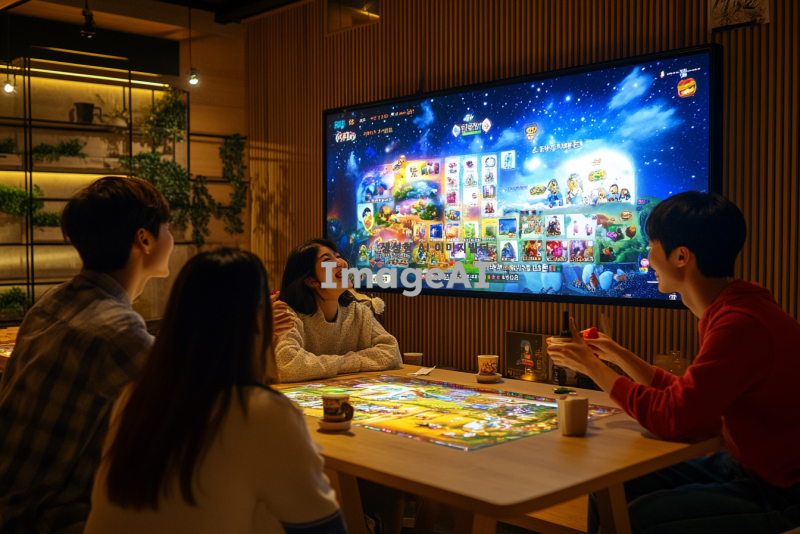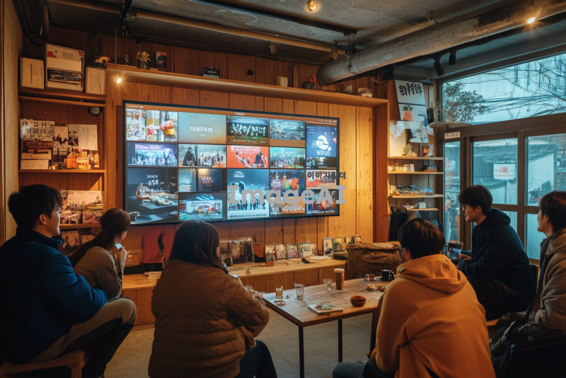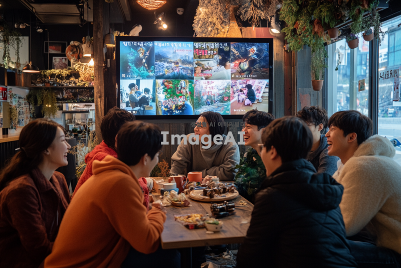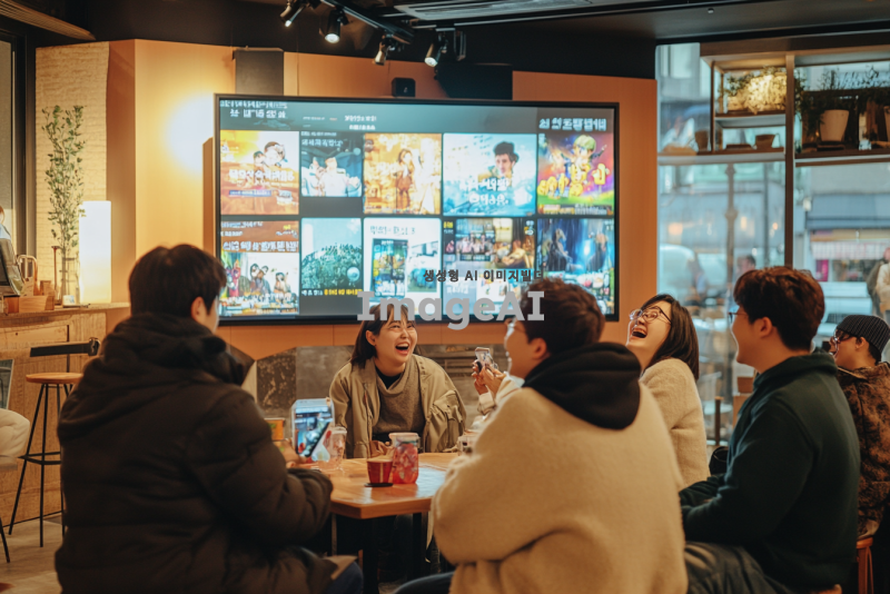 카페 같은 아늑한 공간, 115인치 초대형 화면 TV 앞에서 틀린 그림 찾기를 즐기는 한국인들. TV 화면에는 다양한 그림들이 표시되어 있고, 플레이어는 집중해서 그림을 비교하고 있다. 주변에는 친구들과 가족들이 함께 모여 즐거운 분위기 속에서 웃고 있는 모습이 보인다. 따뜻한 조명이 비추는 카페의 인테리어와 함께 사람들의 표정이 생동감 있게 담겨 있다.