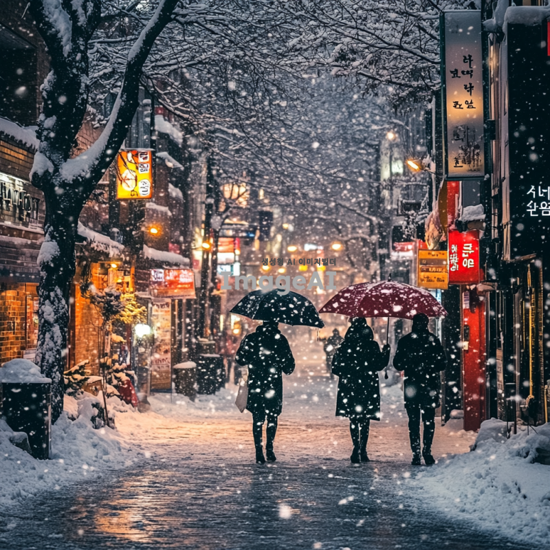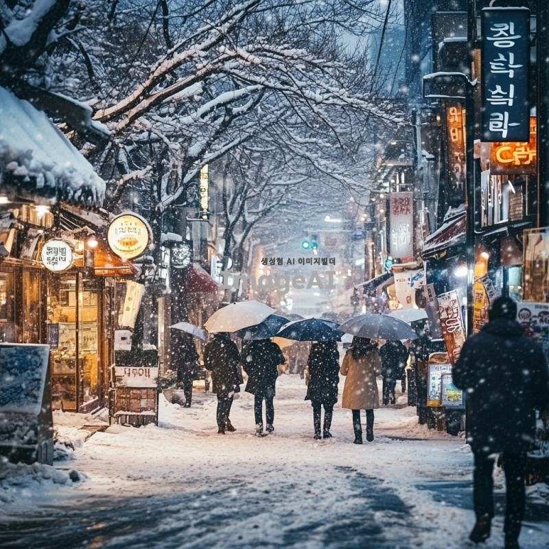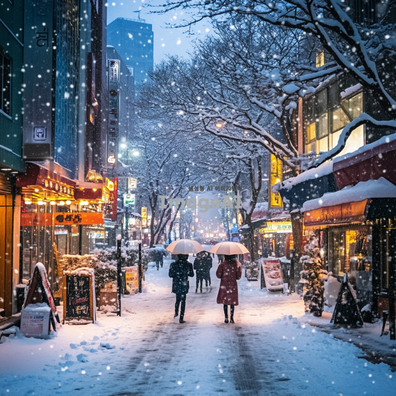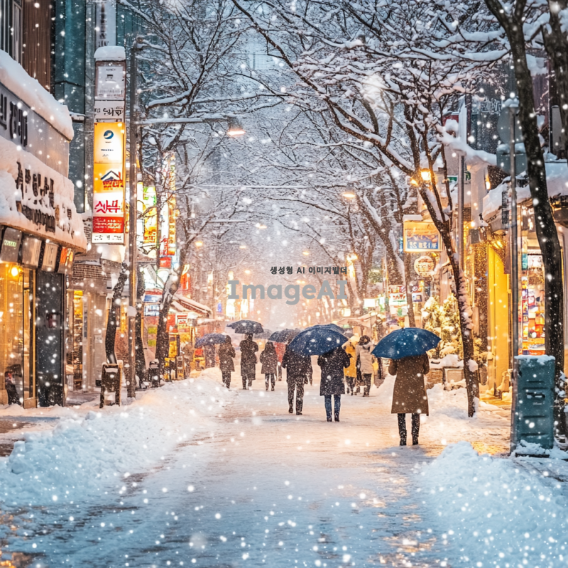 눈이 소복이 쌓인 한국의 도심 거리, 은은한 가로등 불빛 아래 사람들의 발자국 소리가 들리는 풍경, 눈송이가 천천히 내리는 모습, 따뜻한 옷을 입은 사람들이 우산을 쓰고 걷고 있는 장면, 주변에는 눈 덮인 나무와 건물들이 어우러져 있는 아름다운 겨울 풍경.