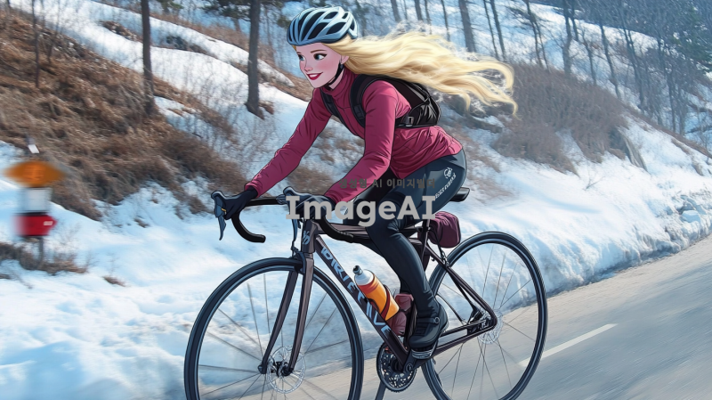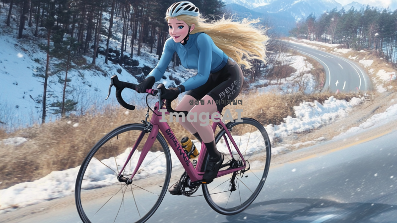 겨울왕국의 엘사가 란도너스 복장을 입고, 아름다운 겨울 풍경 속에서 브레베 로드사이클을 타고 달리는 모습. 엘사의 긴 금발 머리카락이 바람에 흩날리며, 눈 덮인 산과 푸른 하늘이 배경을 이루고 있다. 그녀의 표정은 결단력과 즐거움이 가득하며, 자전거의 디테일과 함께 역동적인 포즈로 생동감 있게 표현된다.