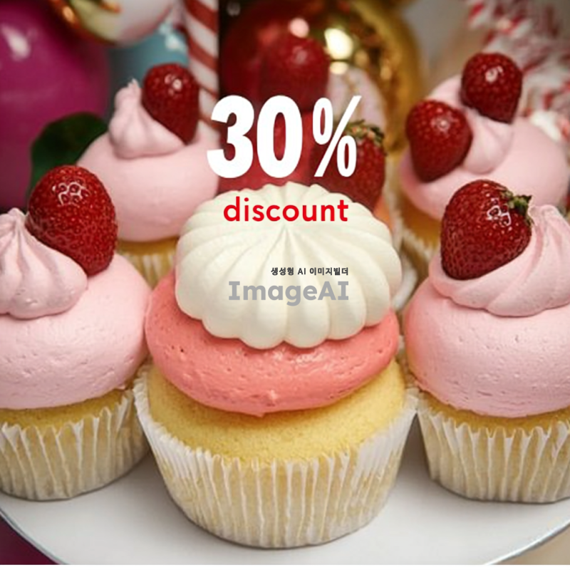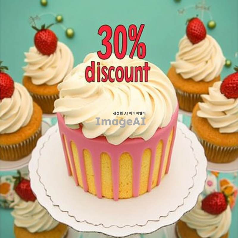다채로운 색깔의 케이크가 중앙에 배치된 웹사이트 배너 디자인, 케이크 위에는 "30% 할인"이라는 문구가 화려한 글씨체로 적혀있고, 배경은 축제 분위기를 연출하는 다양한 색상의 장식으로 가득 차 있으며, 아기자기한 요소들이 포함된 생동감 넘치는 이미지.