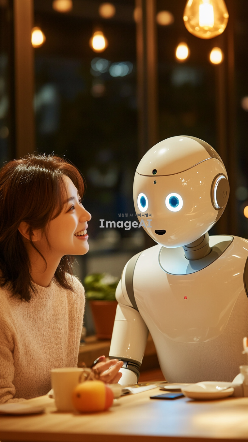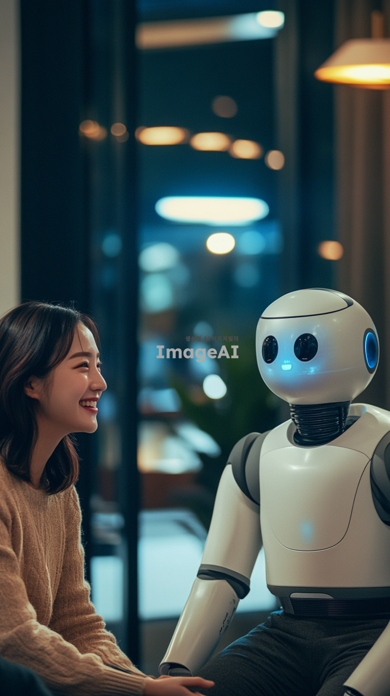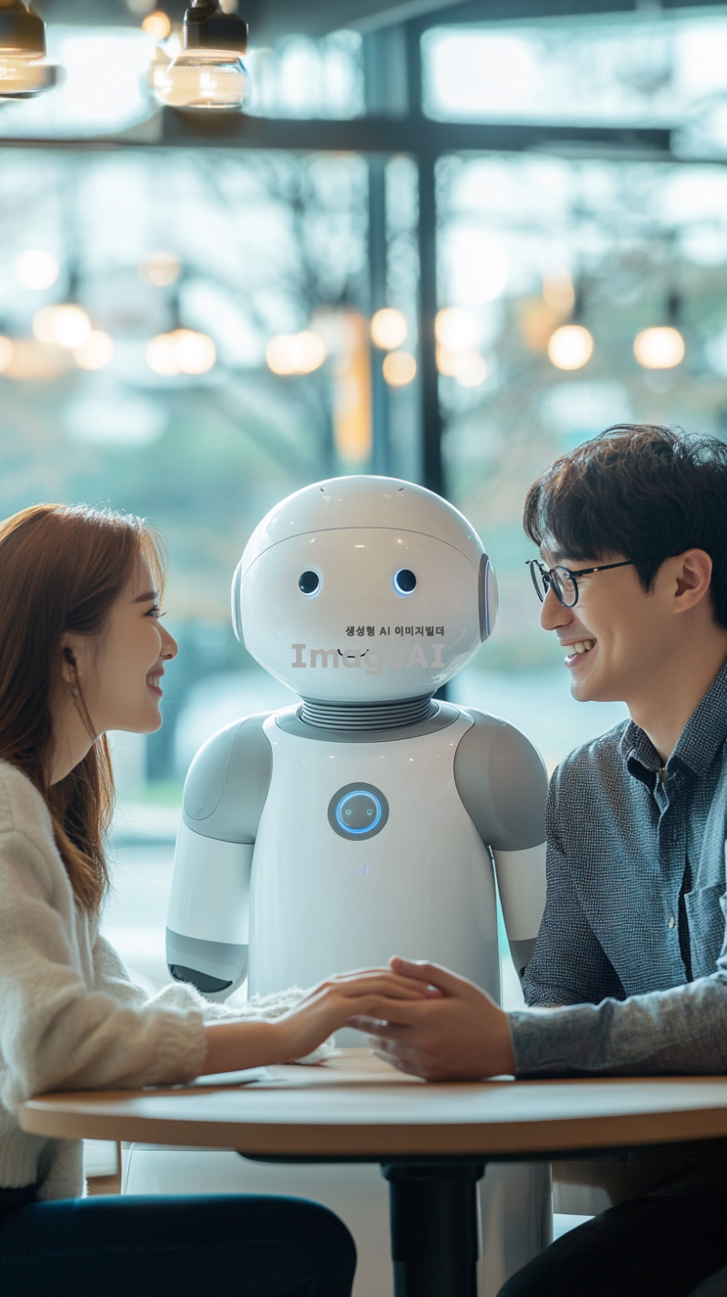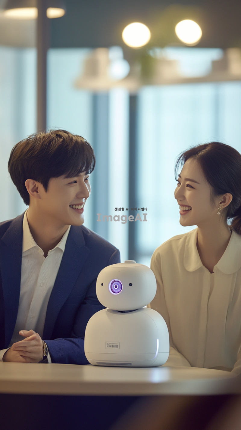 친절한 인공지능이 사람들에게 도움을 주는 장면, 따뜻한 미소를 지으며 대화하는 한국인 남성과 여성, 현대적인 사무실 배경, 부드러운 조명과 편안한 분위기, 서로의 이야기에 귀 기울이는 모습, 친근한 표정과 제스처, 기술과 인간의 조화로운 상호작용을 강조하는 이미지.
