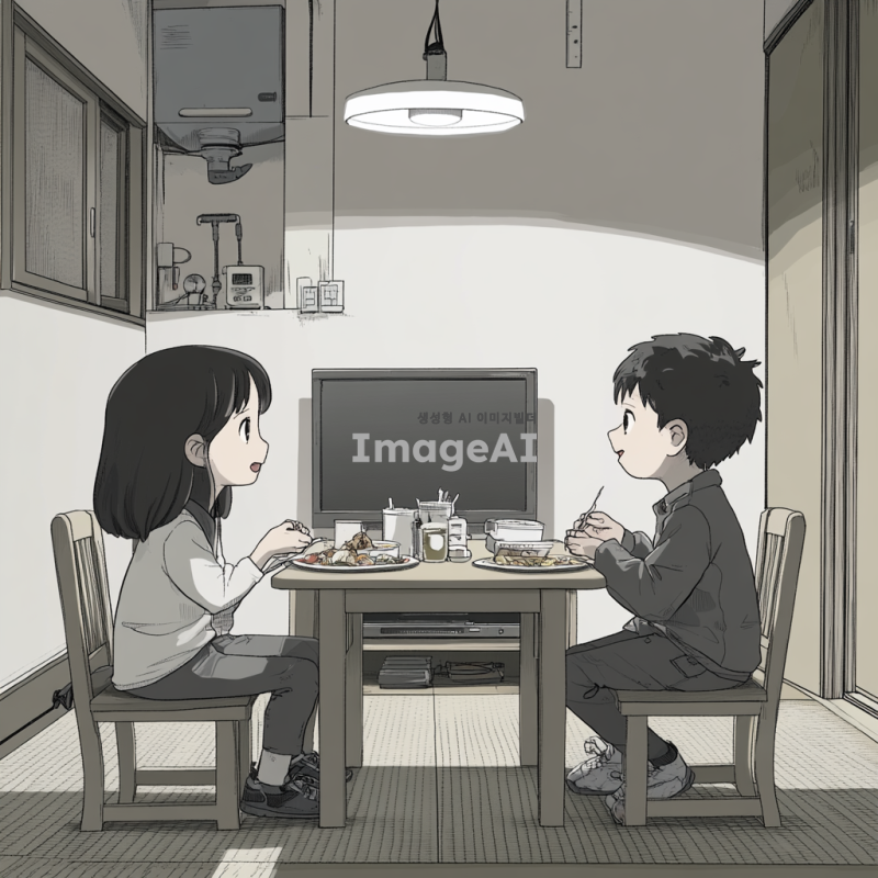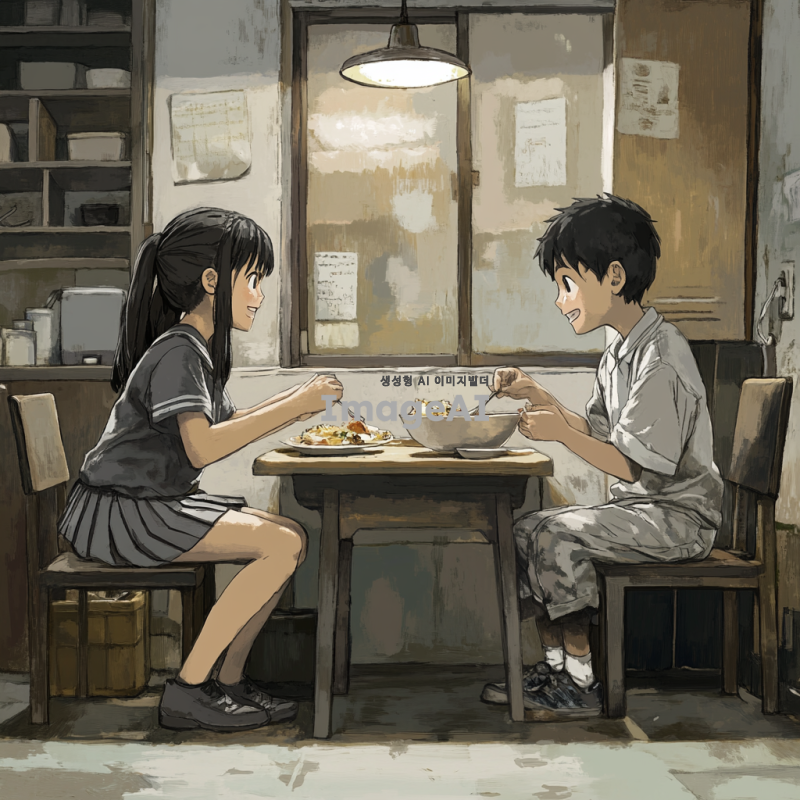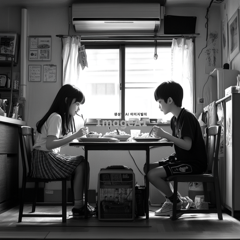 반지하 단칸방에서 남매가 작은 밥상에 마주 앉아 저녁을 먹고있다. 누나는 고등학생이고 남동생은 초등학생이다. 누나는 교복을 입고 있고 동생은 잠옷을 입고있다.