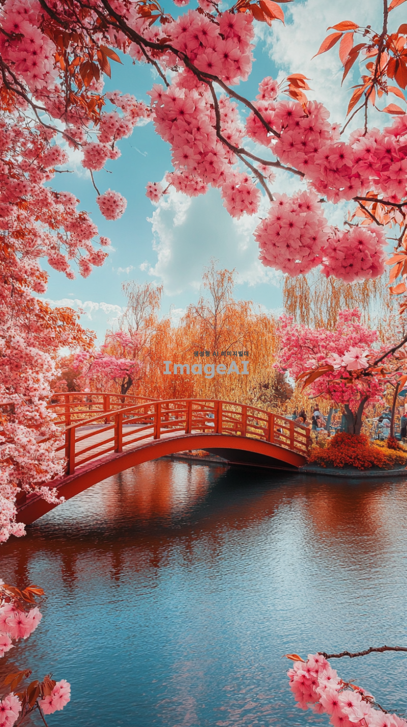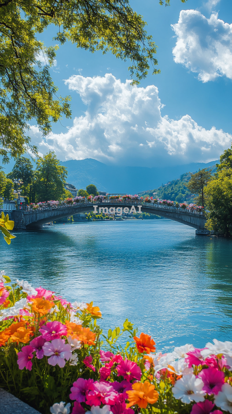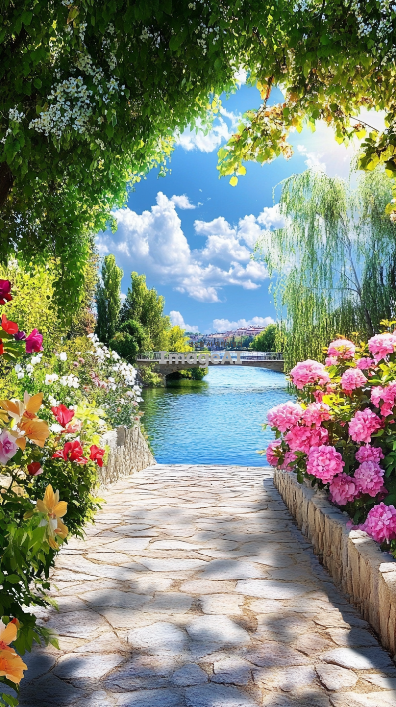 멀리 다리가 보이고 강물이 그 다리 사이를 흐르는 아름다운 풍경. 다리 위에는 화사한 꽃들이 만발해 있고, 배경에는 푸른 하늘과 흰 구름이 부드럽게 흘러가는 모습. 자연의 평화로운 분위기와 함께 따스한 햇살이 비추는 장면.