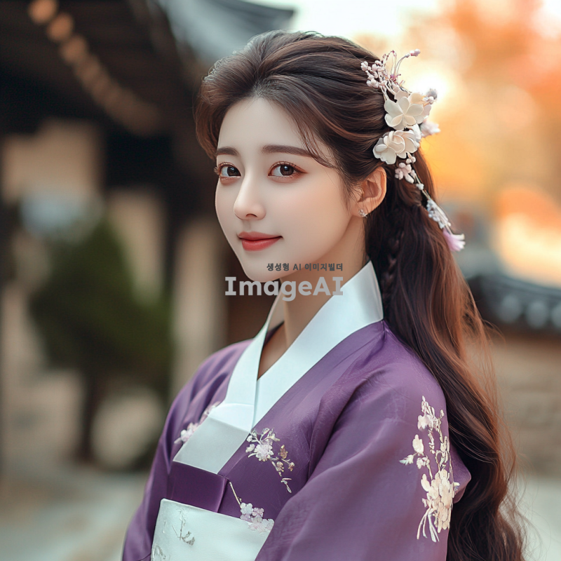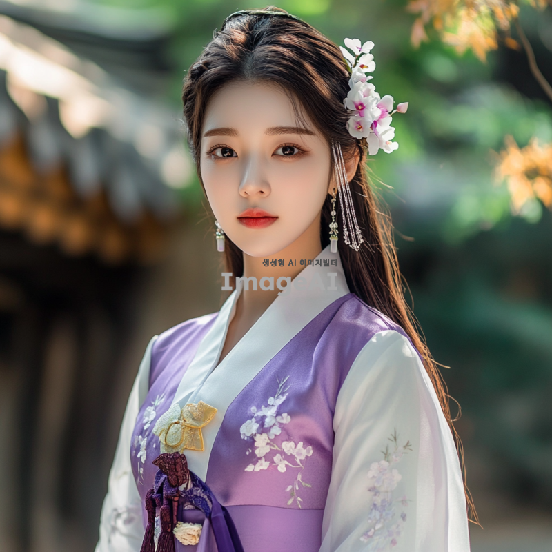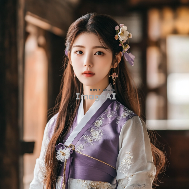 자주색과 흰색 한복을 입고 있는 갈색 긴머리의 한국인 여성, 꽃비녀를 꽂고 있는 모습, 전통적인 배경에서 우아하게 서 있는 모습.