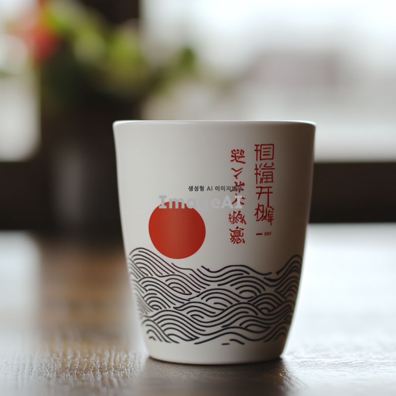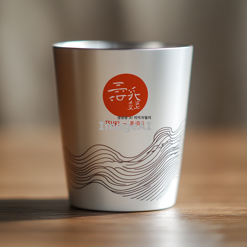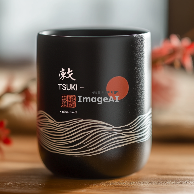 180ml 알루미늄 잔에 새길 로고 디자인, "TSUKI - 静かな夜"라는 텍스트 포함, 달의 실루엣과 파도 패턴을 조화롭게 배치, 도장 느낌의 붉은 인쇄 스타일로 강조. 전체적으로 세련되고 현대적인 감각을 유지하며, 조용하고 평화로운 분위기를 전달하는 디자인.