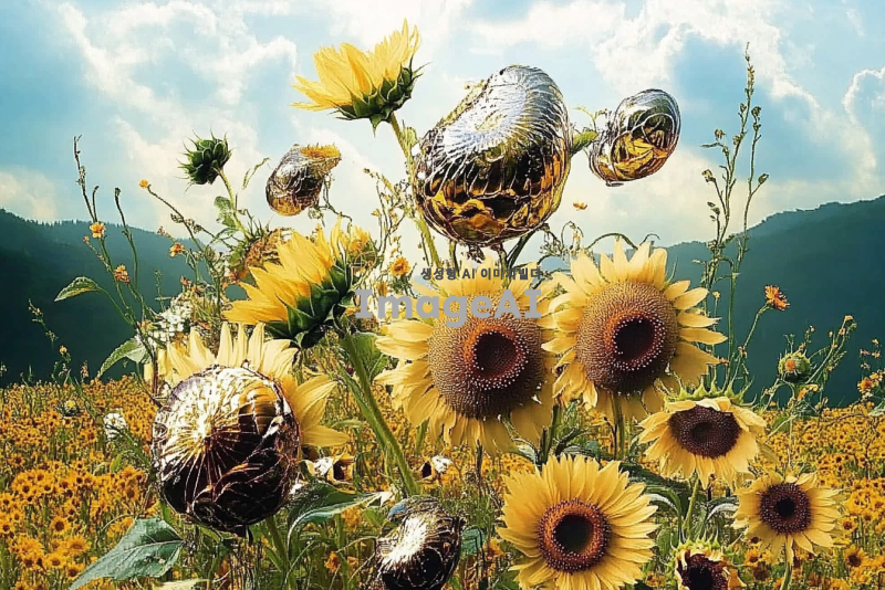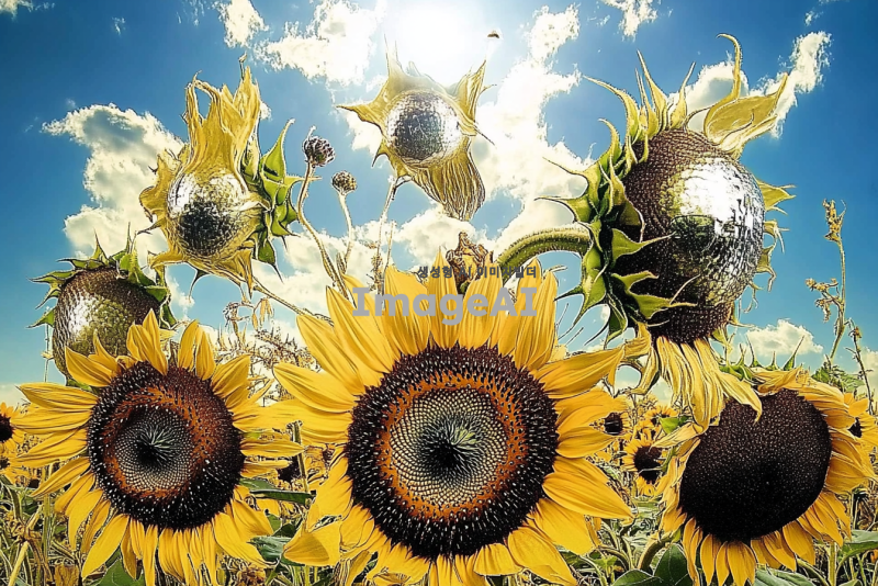 밝고 역동적인 느낌의 해바라기가 가득한 들판, 햇살이 비추는 가운데 해바라기들이 바람에 흔들리며 생동감 넘치는 모습, 푸른 하늘과 흰 구름이 배경에 어우러진 장면, 따뜻한 색감으로 표현된 자연의 아름다움.