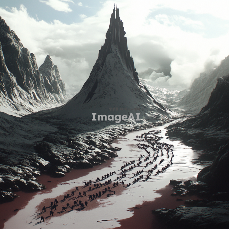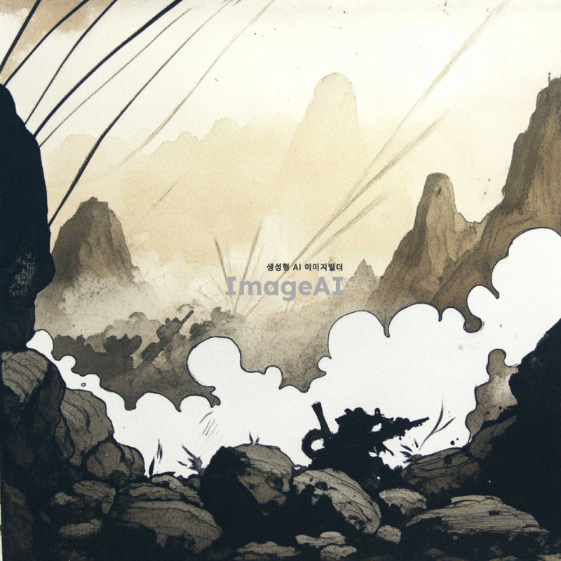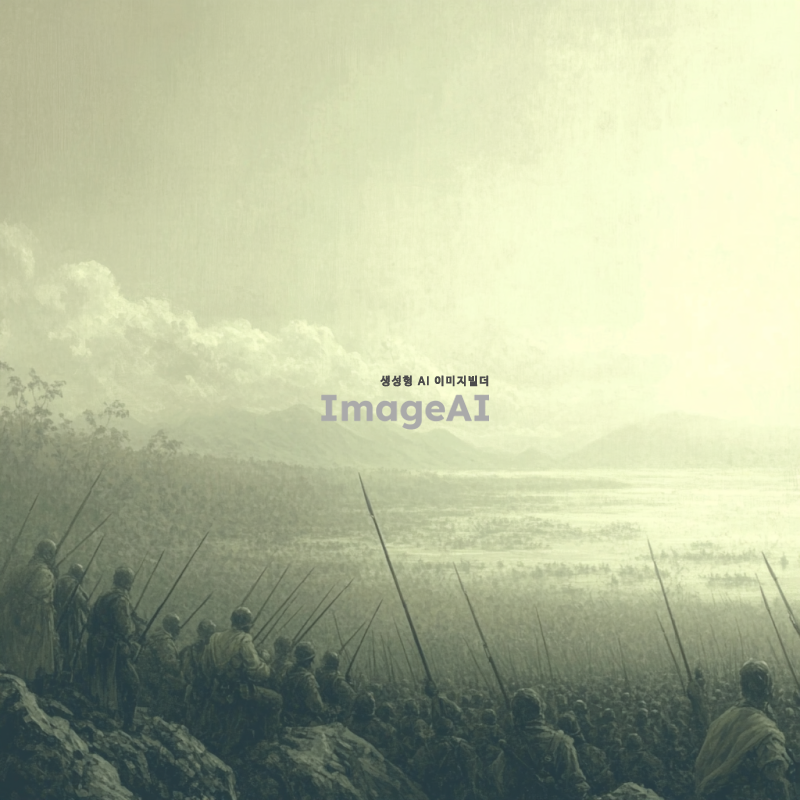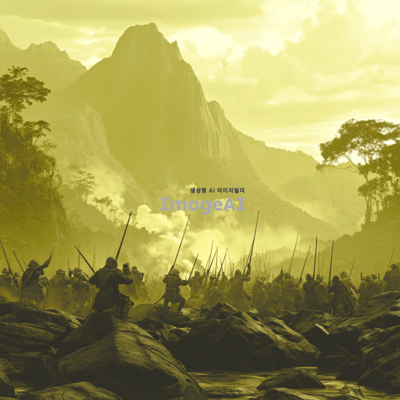 곶자왈의 독특한 풍경을 배경으로 한 전쟁 장면을 모노톤으로 표현한 이미지. 고요한 숲속과 바위들 사이에서 전투가 벌어지는 모습, 먼 배경에는 흐릿하게 보이는 산과 구름, 전투 중인 군인들의 실루엣이 강조된 장면. 전체적으로 음영과 대비를 활용하여 긴장감과 서정적인 분위기를 동시에 느낄 수 있도록.