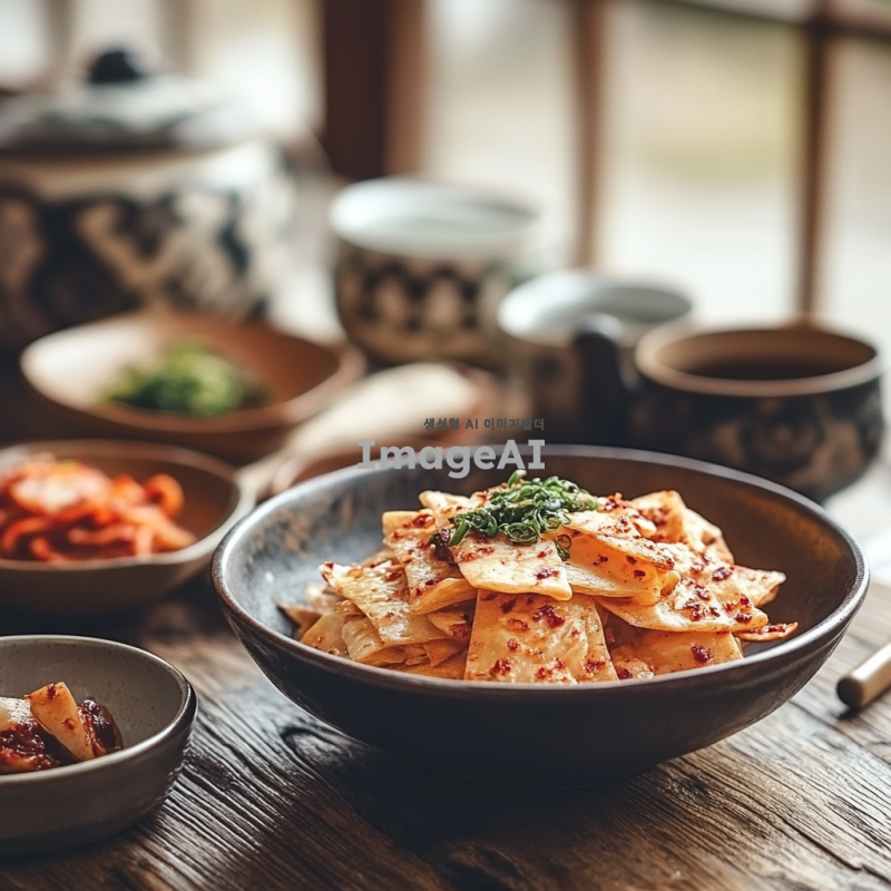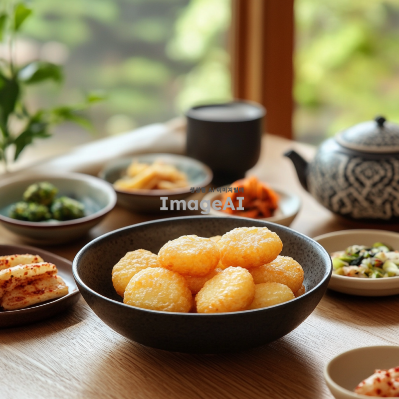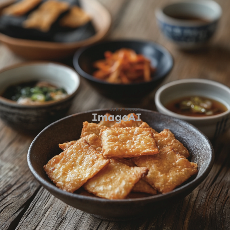한국의 전통 누룽지를 담은 따뜻한 분위기의 이미지. 누룽지가 담긴 그릇이 나무 테이블 위에 놓여 있고, 주변에는 찻잔과 전통 한국식 반찬이 어우러져 있는 모습. 자연광이 부드럽게 비추어져 아늑한 느낌을 주며, 누룽지의 바삭한 질감과 고소한 색깔이 강조되도록. 배경에는 한국의 전통 문양이 있는 천이나 소품이 살짝 보이도록 구성.