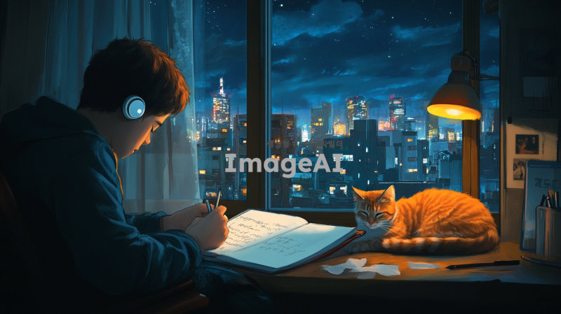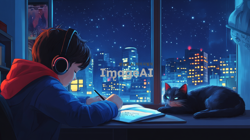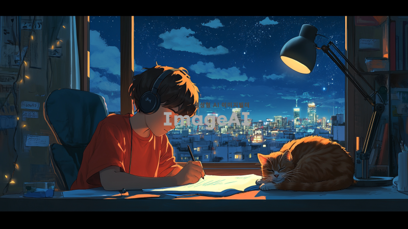 이 이미지는 한 소년이 블루투스 이어폰을 착용하고 창문 밖의 밤하늘이 보이는 도시 풍경을 배경으로 쾌적한 방 안에서 글쓰기나 그림 그리기에 몰두하고있습니다.고양이가 옆에서 잠들어 있어 평온하고 창조적인 분위기를 더해주고있습니다.
