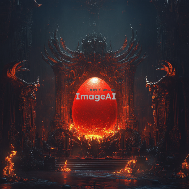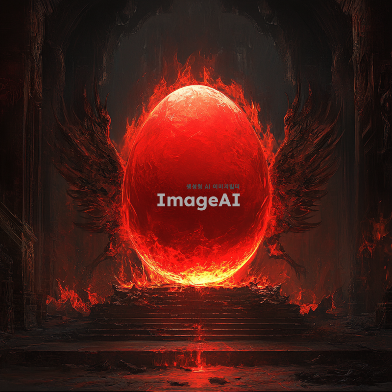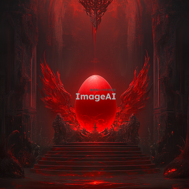 붉은 달걀을 중심으로 한 빨간색 악마 분위기의 웅장한 장면을 그려주세요. 배경은 어두운 색조로 설정하고, 달걀은 빛나는 붉은색으로 강조하여 신비로운 느낌을 줍니다. 주변에는 악마의 상징적인 요소들, 예를 들어 뿔, 날개, 그리고 불꽃 같은 장식들이 어우러져 역동적인 분위기를 연출합니다. 전체적으로 강렬하고 위압적인 느낌이 드는 구성을 원합니다.