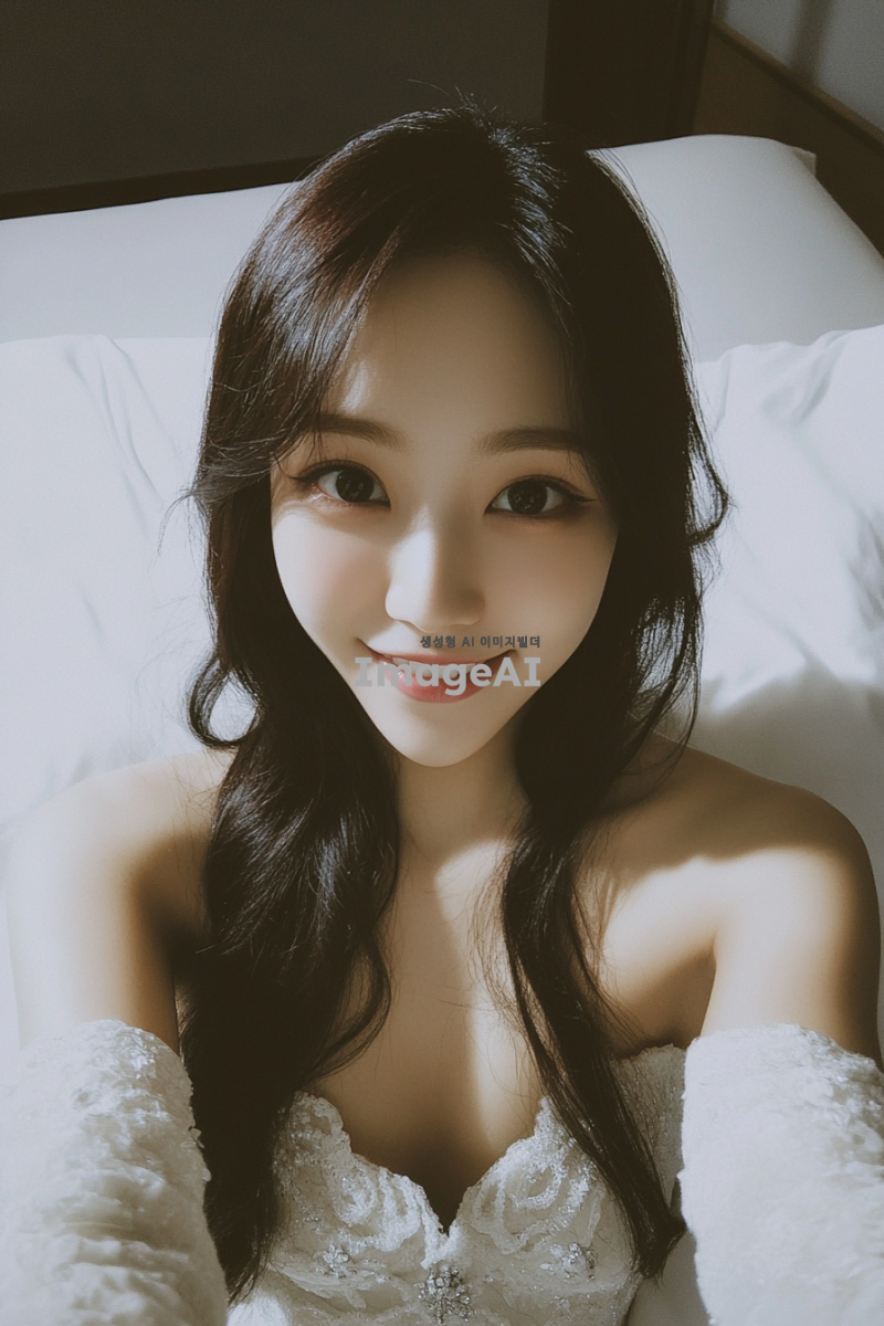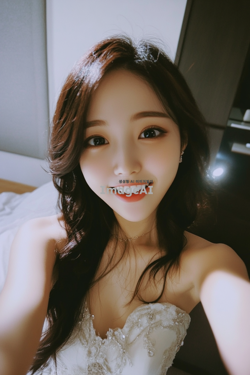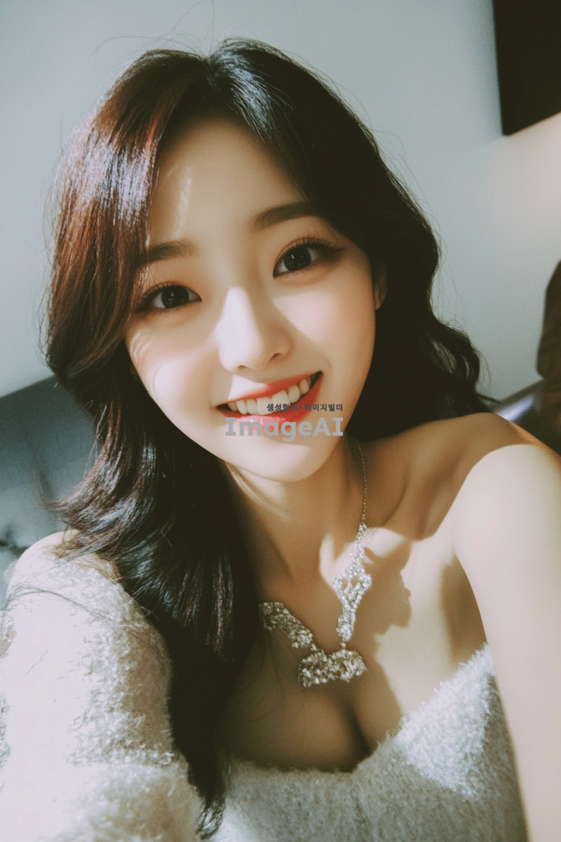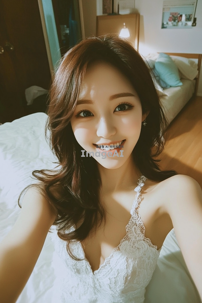 방에서 셀카를 찍고 있는 한국인 여자친구, 밝은 미소와 함께 카메라를 바라보며 귀여운 포즈를 취하고 있는 모습,