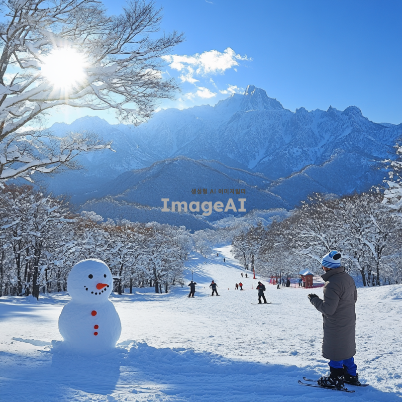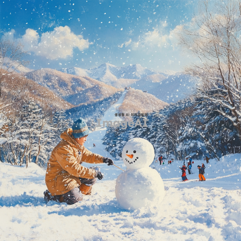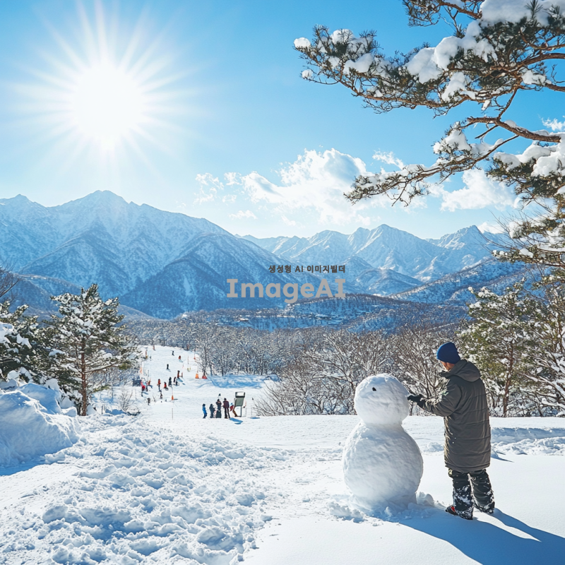 눈 덮인 산과 푸른 하늘 아래 따뜻한 겨울 햇살을 받으며, 두꺼운 겨울 외투를 입고 있는 한국인 남성이 눈사람을 만드는 모습. 주변에는 눈으로 덮인 나무와 겨울 풍경이 펼쳐져 있고, 멀리서 스키를 타는 사람들의 모습이 보인다. 따뜻한 겨울 분위기가 느껴지는 장면.