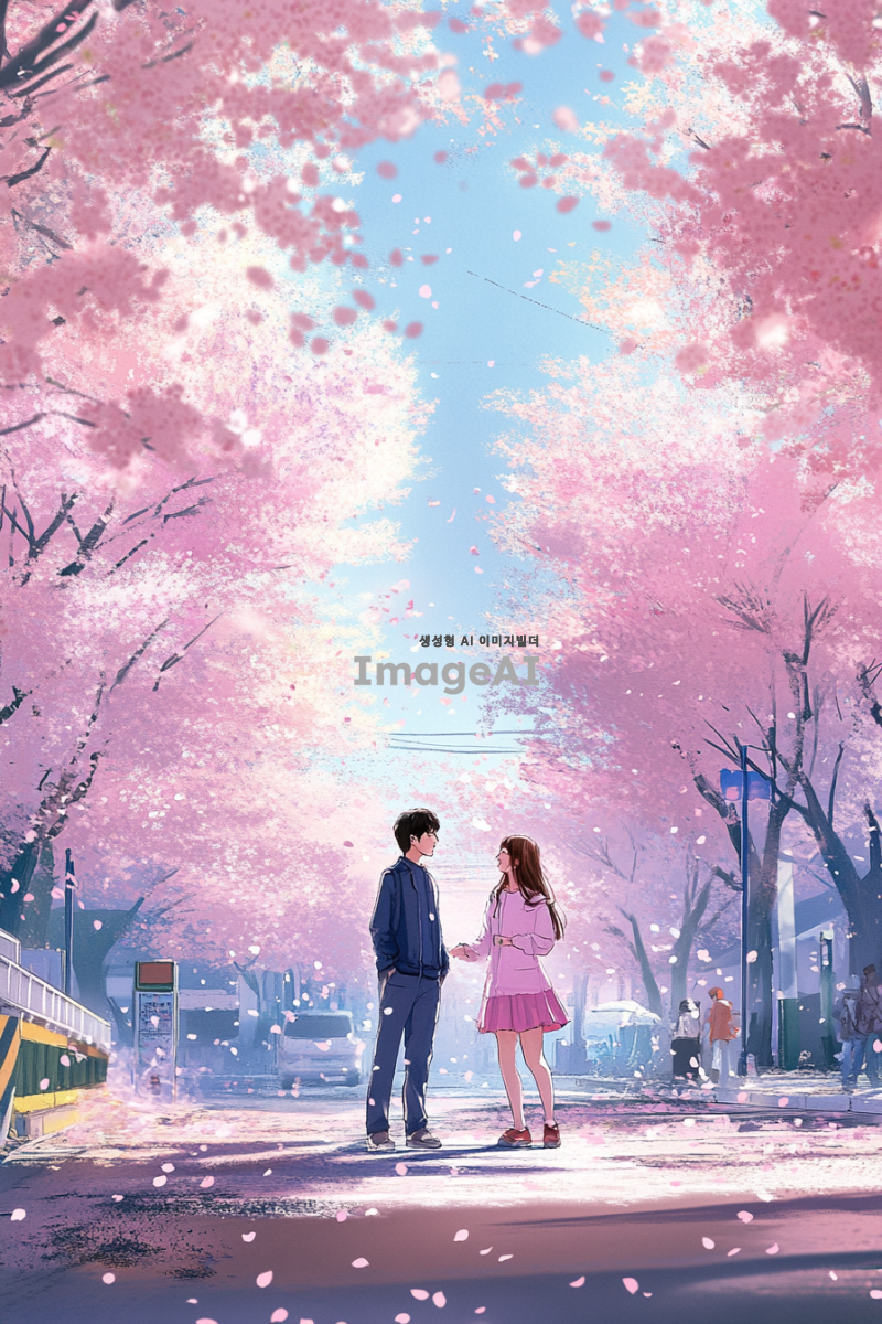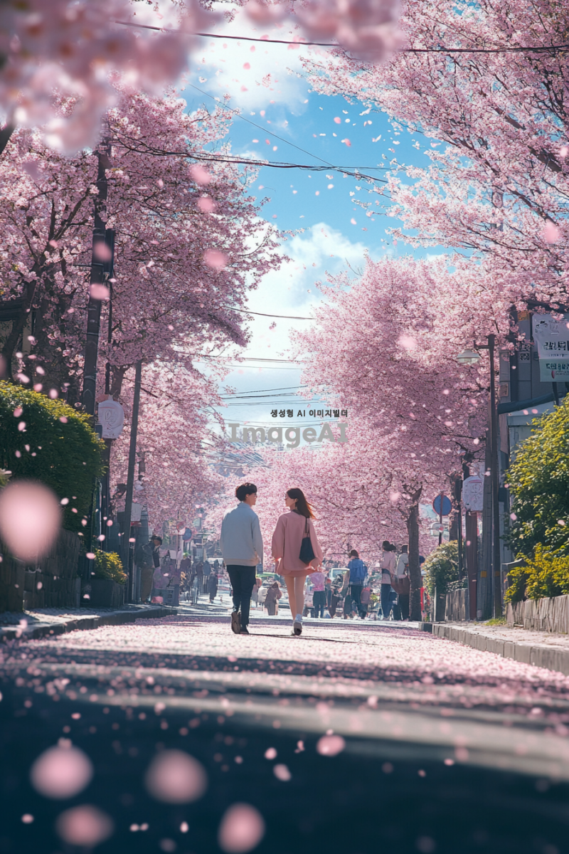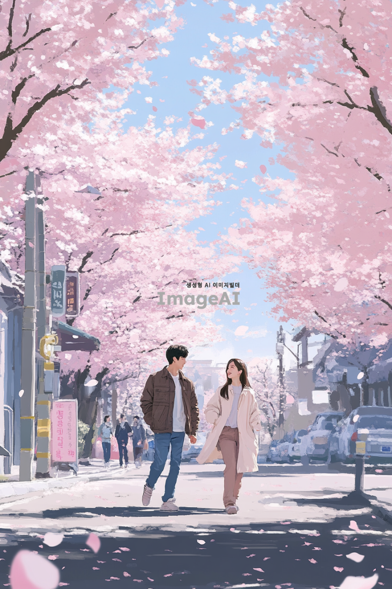벚꽃이 만개한 거리에서 함께 걷고 있는 두 한국인 남녀의 모습. 따뜻한 봄날, 벚꽃잎이 바람에 흩날리며 아름다운 풍경을 이루고 있다. 두 사람은 서로 웃으며 대화하고 있으며, 주변에는 벚꽃나무와 파란 하늘이 조화를 이루고 있다.