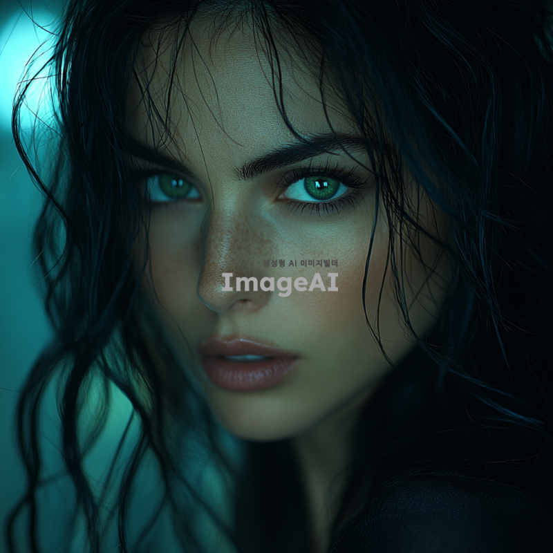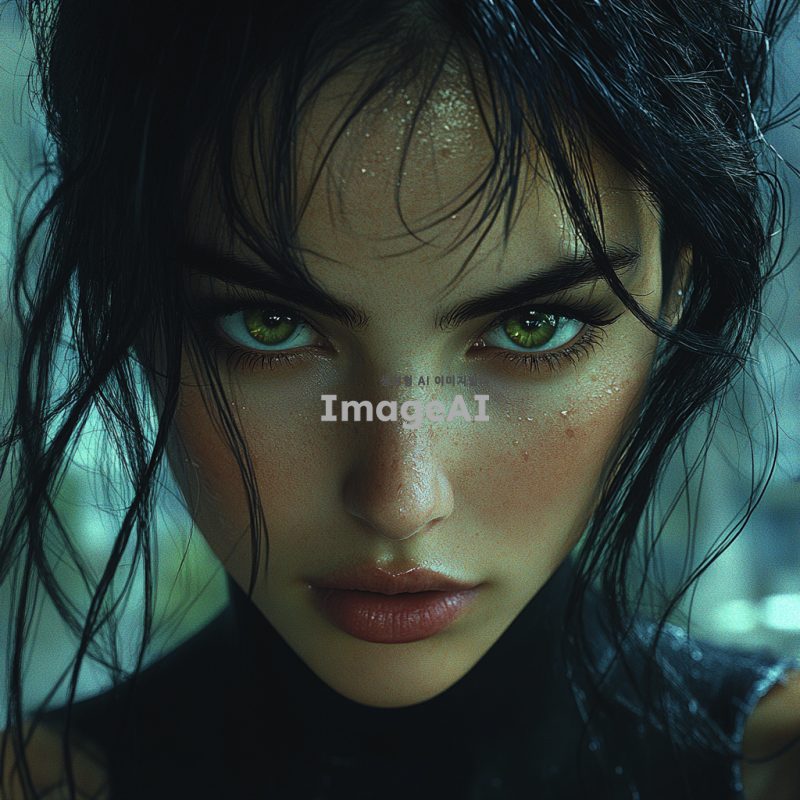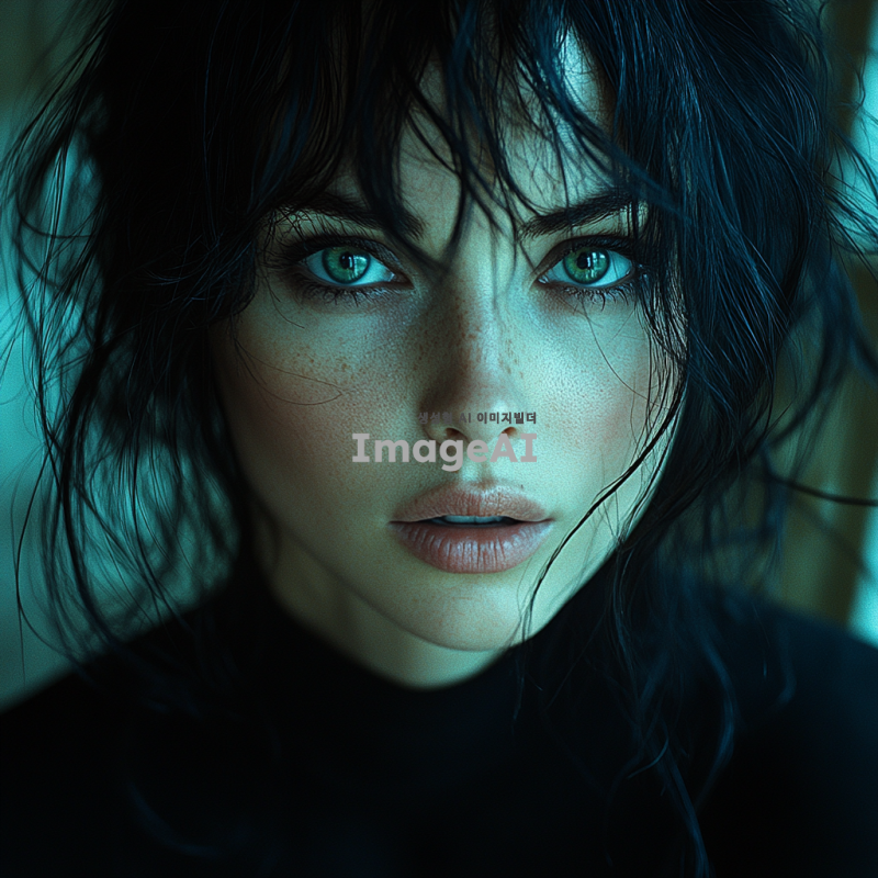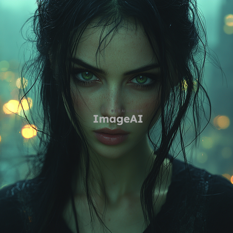 여자, 흑발, 녹안, 검정 옷을 입고 있는 인물, 느와르 분위기의 도시 배경, 어두운 조명과 강렬한 그림자, 신비로운 표정, 세련된 스타일과 강렬한 느낌을 강조한 이미지.