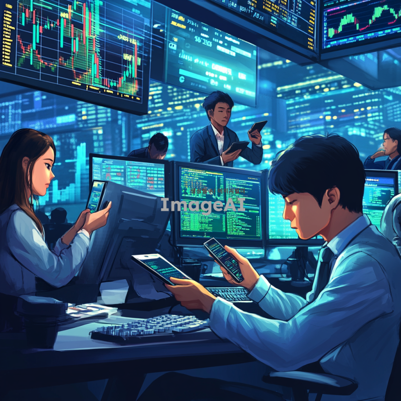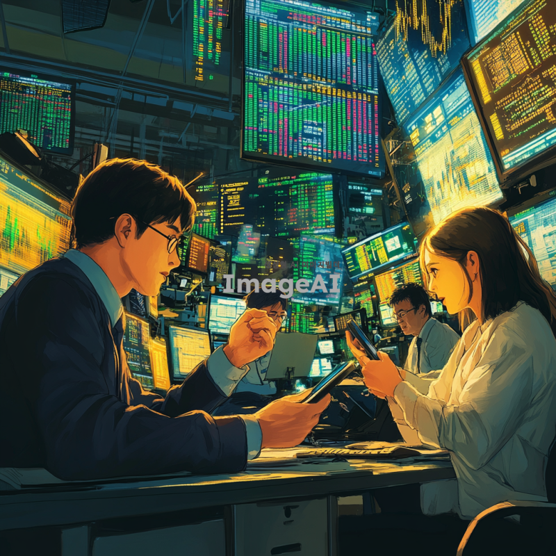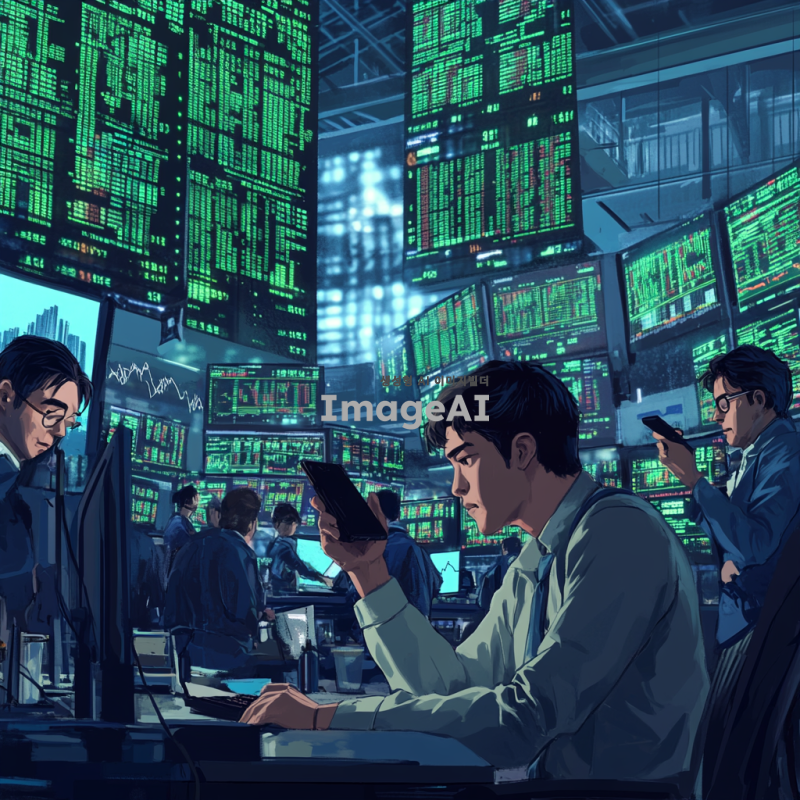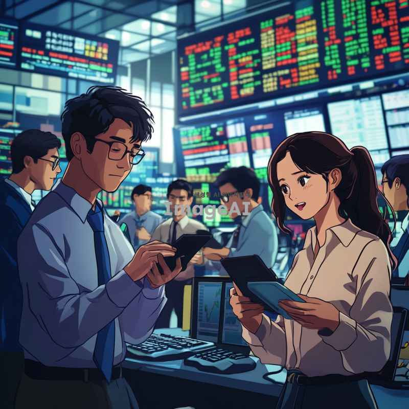 투자자와 투기자가 주식 시장에서 각각의 방식으로 주식에 접근하는 모습을 담은 장면. 투자자는 신중하게 차트를 분석하고, 노트에 메모를 하며, 컴퓨터 화면에 집중하고 있다. 반면, 투기자는 빠르게 변동하는 주식 가격을 보며 흥분한 표정으로 스마트폰을 확인하고 있다. 배경은 주식 거래소의 붐비는 분위기로, 다양한 투자자들이 활동하는 모습이 보인다. 각각의 인물은 한국인 남성과 여성으로, 다양한 연령대의 투자자들이 함께 있는 장면을 연출한다.