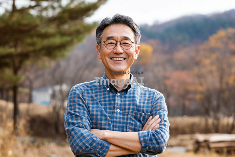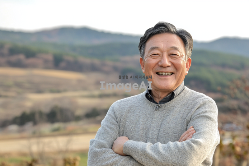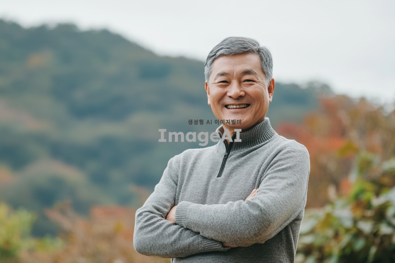 팔짱을 끼고 서 있는 60대 한국 남성이 환하게 웃고 있는 모습의 전신 사진. 배경은 자연 풍경으로, 남성은 편안한 캐주얼 복장을 착용하고 있으며, 얼굴에는 친근한 미소가 가득하다.