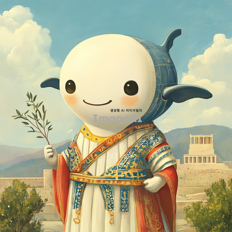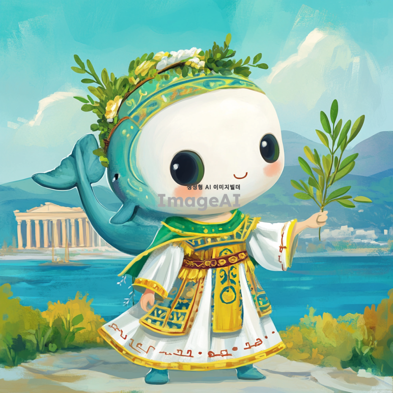 그리스 시대의 전통 복장을 입고, 고래 머리를 가진 귀여운 2등신 캐릭터. 배경은 고대 그리스의 풍경으로, 아테네의 파르테논 신전이 보이는 장면. 캐릭터는 밝고 유쾌한 표정을 지으며, 손에는 작은 올리브 가지를 들고 있다. 전체적으로 아기자기하고 사랑스러운 느낌을 강조.