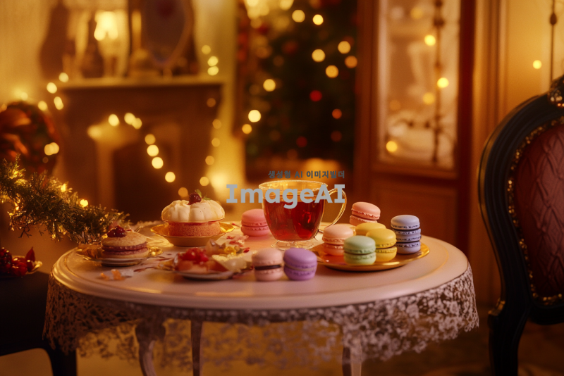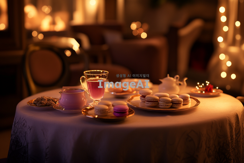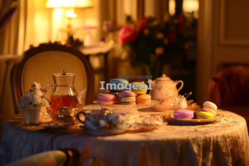 고급스러운 분위기의 아늑한 식탁 위에 잠봉뵈르와 히비스커스 차, 그리고 다양한 색상의 마카롱이 놓여 있는 장면. 따뜻한 조명이 비추는 식탁은 우아한 테이블보와 함께 세팅되어 있으며, 주변에는 편안한 의자와 아기자기한 장식들이 배치되어 있어 아늑한 느낌을 주는 공간. 전체적으로 화사하지 않지만 세련된 느낌을 살린 이미지.