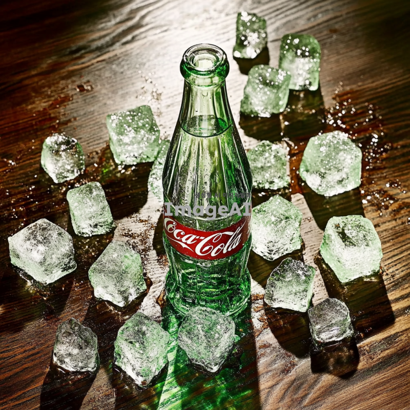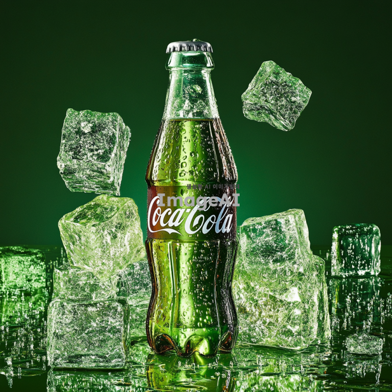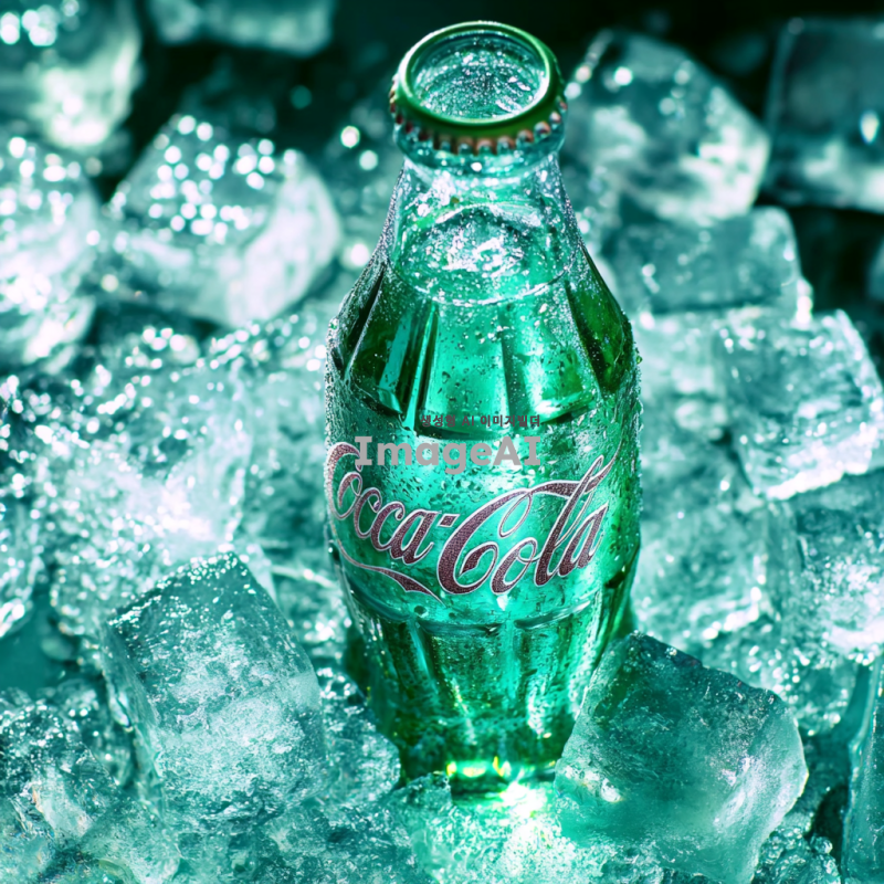얼음에 둘러싸인 시원한 코카콜라 한 병, 주변에는 얼음 조각들이 흩어져 있어 차가운 분위기를 연출, 초록 빛이 얼음과 병에 반사되어 빛나는 장면.