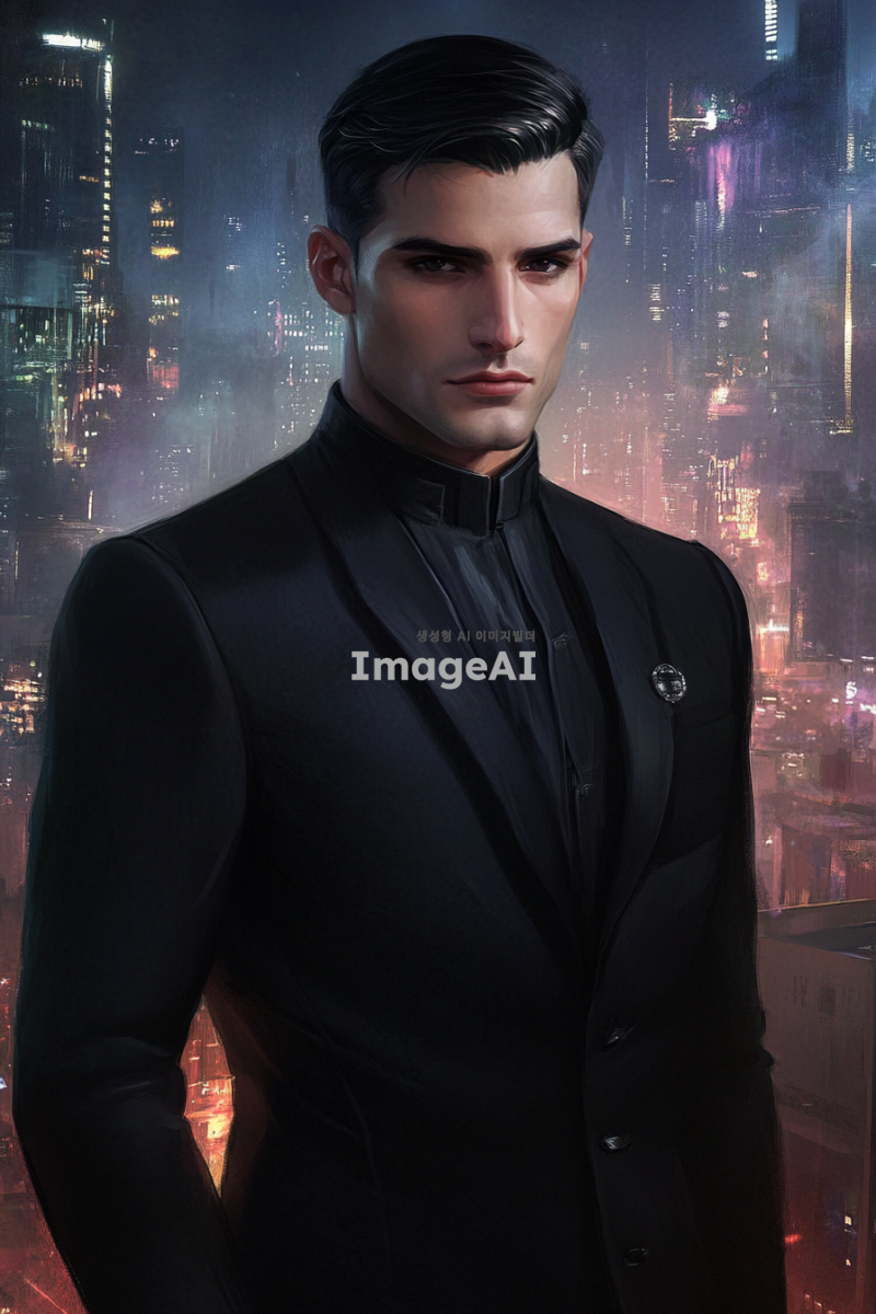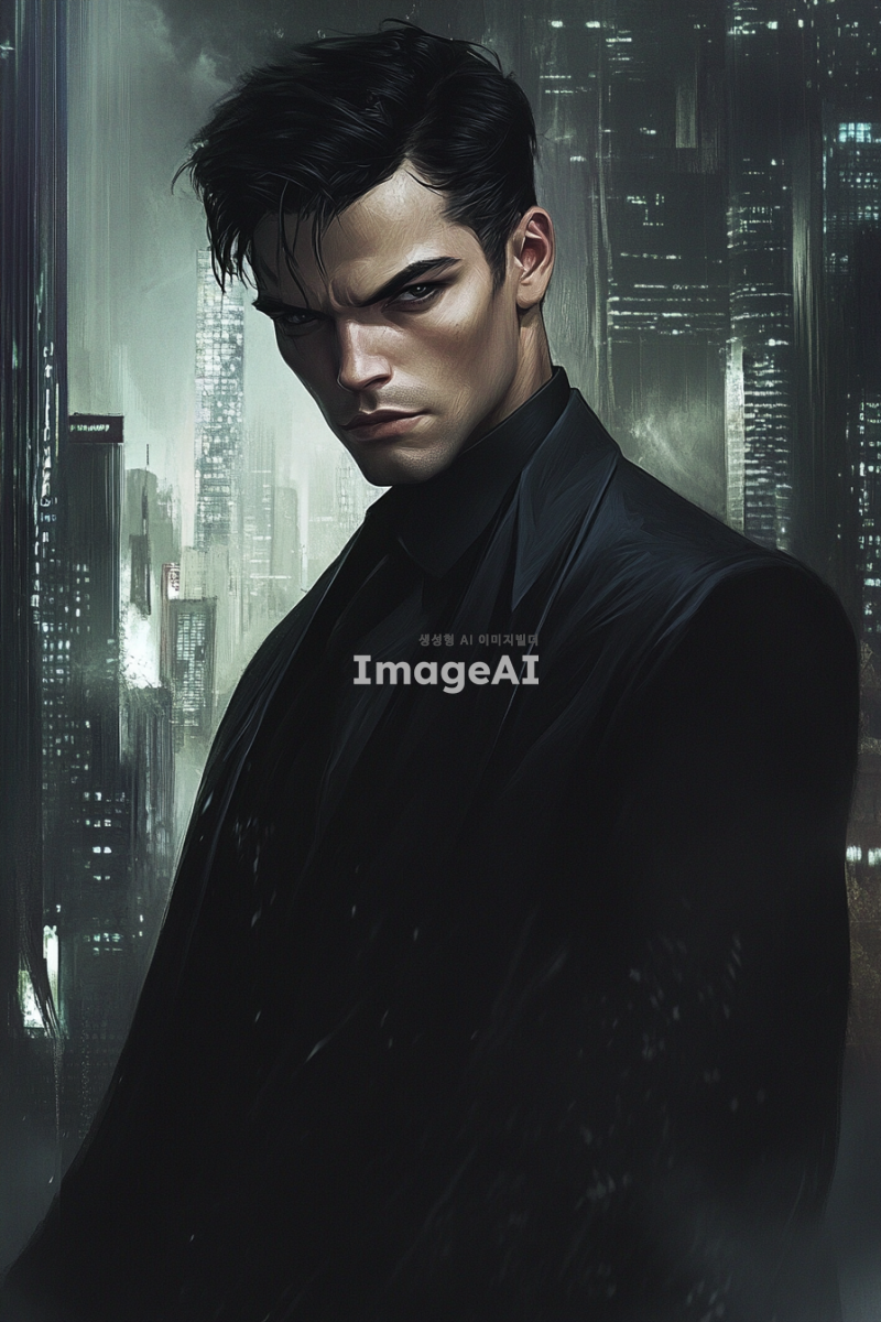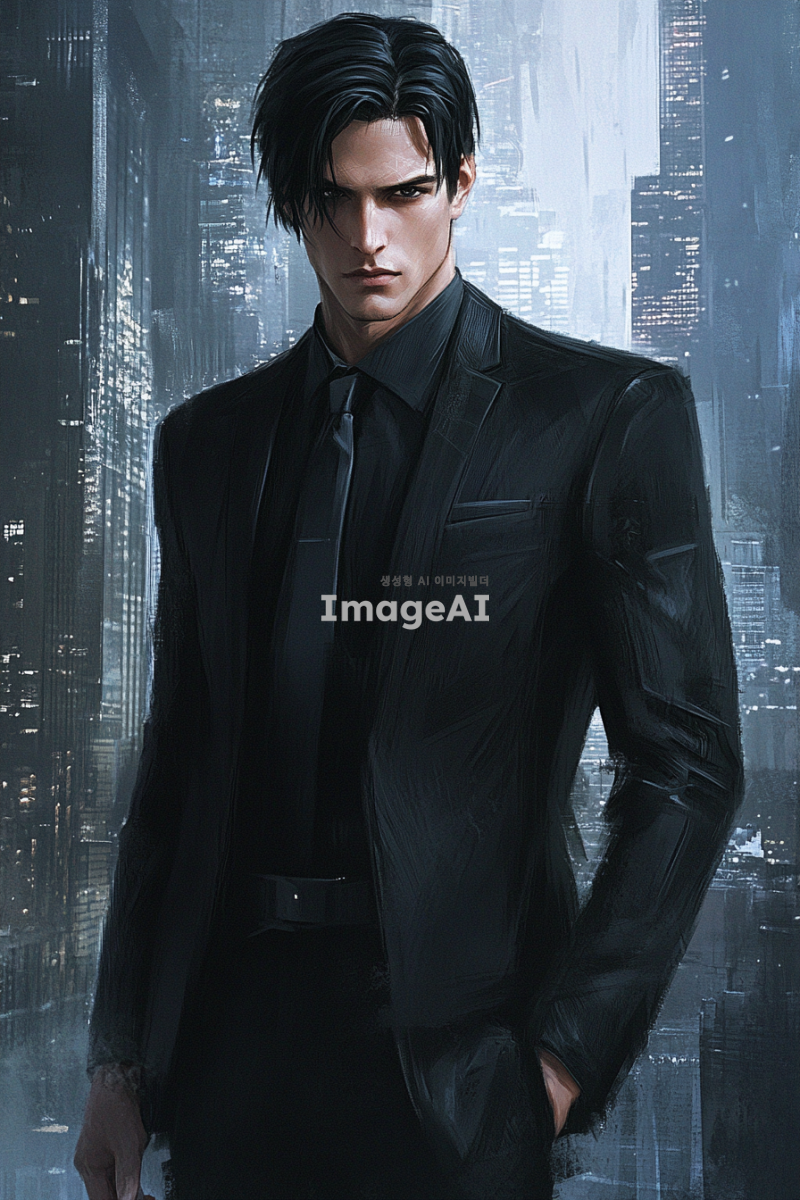 국정원 요원으로서 매우 잘생긴 남성, 검은 머리와 검은 눈을 가진 모습. 검정색 정장을 입고 있으며, 강렬한 눈빛과 자신감 넘치는 자세로 서 있는 모습. 배경은 현대적인 도시 풍경으로, 긴장감과 신비로운 분위기가 느껴지는 장면.