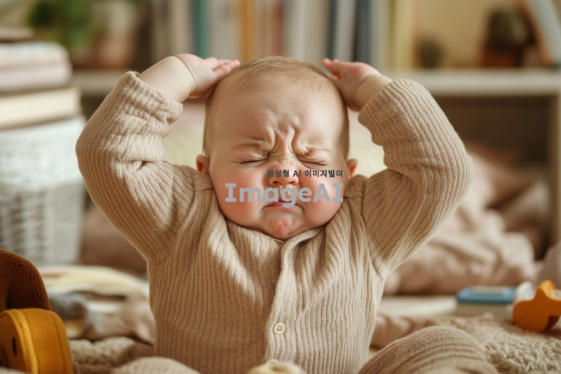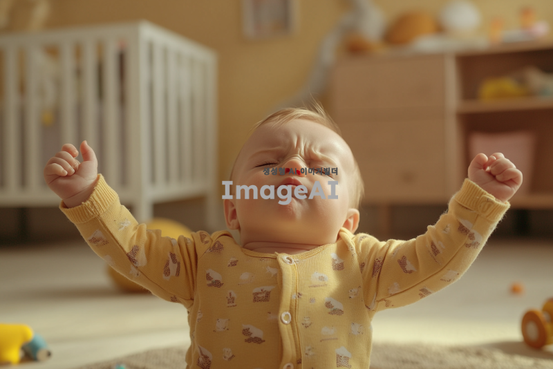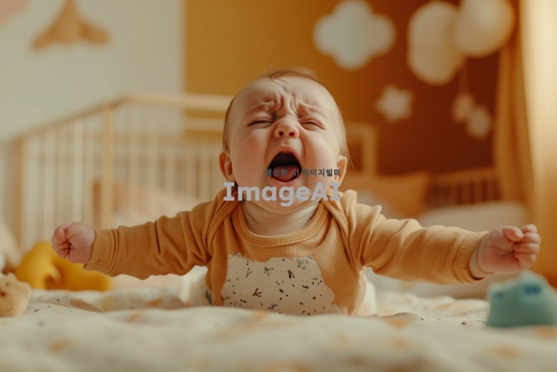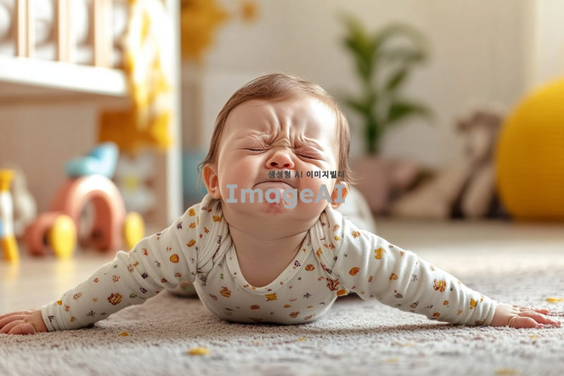 생후 4개월 아기가 팔다리를 뻗대며 불편해하는 모습, 아기의 표정은 고통스러워 보이며 주위는 따뜻한 색조의 아기방, 아기는 귀여운 아기옷을 입고 있고, 장난감이 주변에 흩어져 있는 장면.