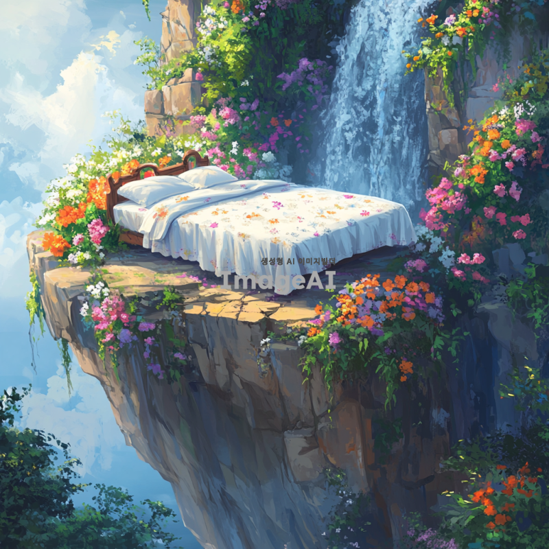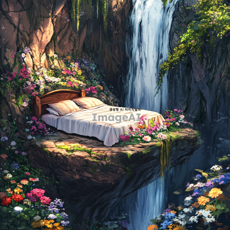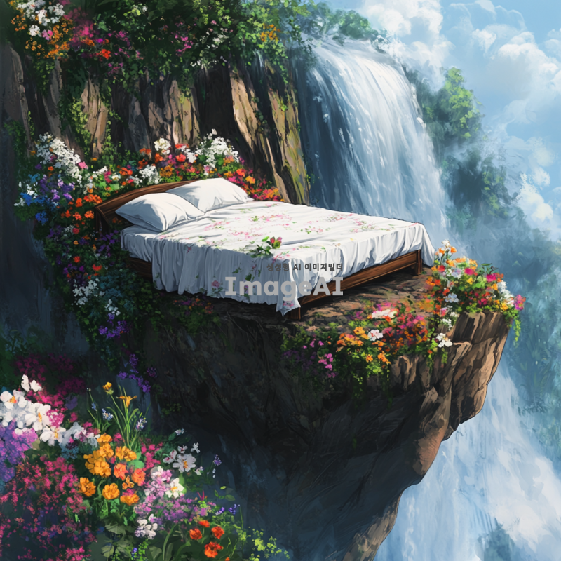 절벽 중간에 튀어나온 돌 위에 올라가 있는 포근하고 아름다운 침대를 그려주세요. 침대 주변에는 다양한 색깔의 꽃들이 피어있고, 침대 위쪽에서는 시원한 폭포가 흐르고 있는 장면을 표현해주세요. 자연의 아름다움과 평화로운 분위기가 느껴지도록 해주세요.