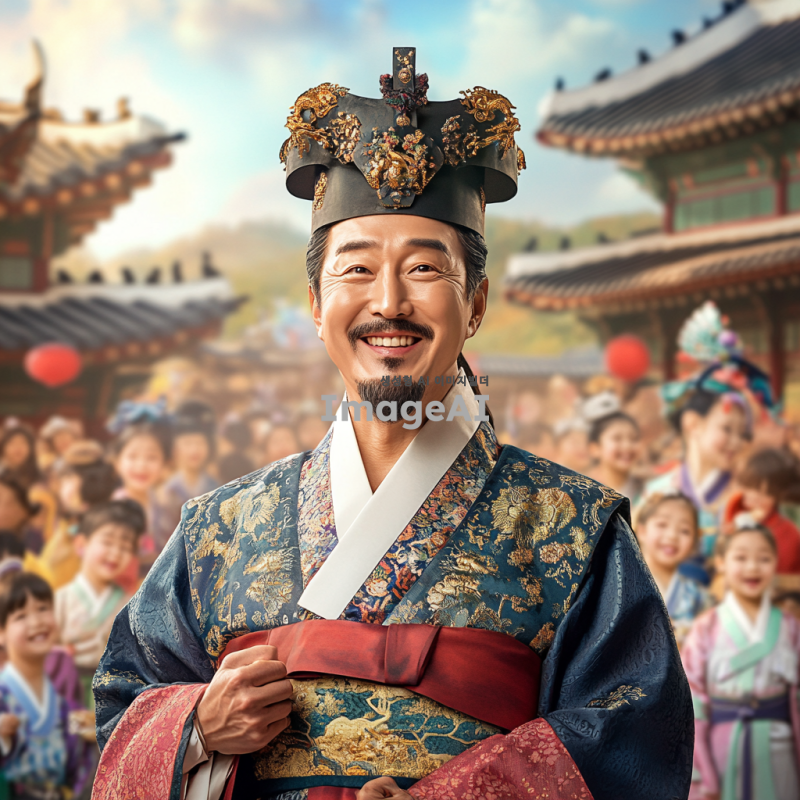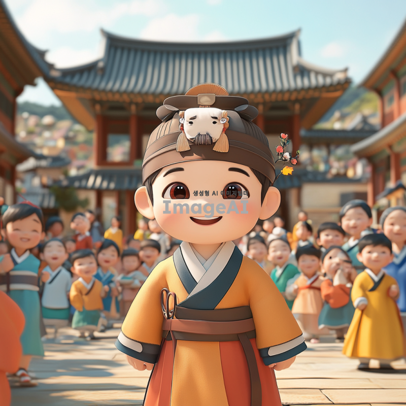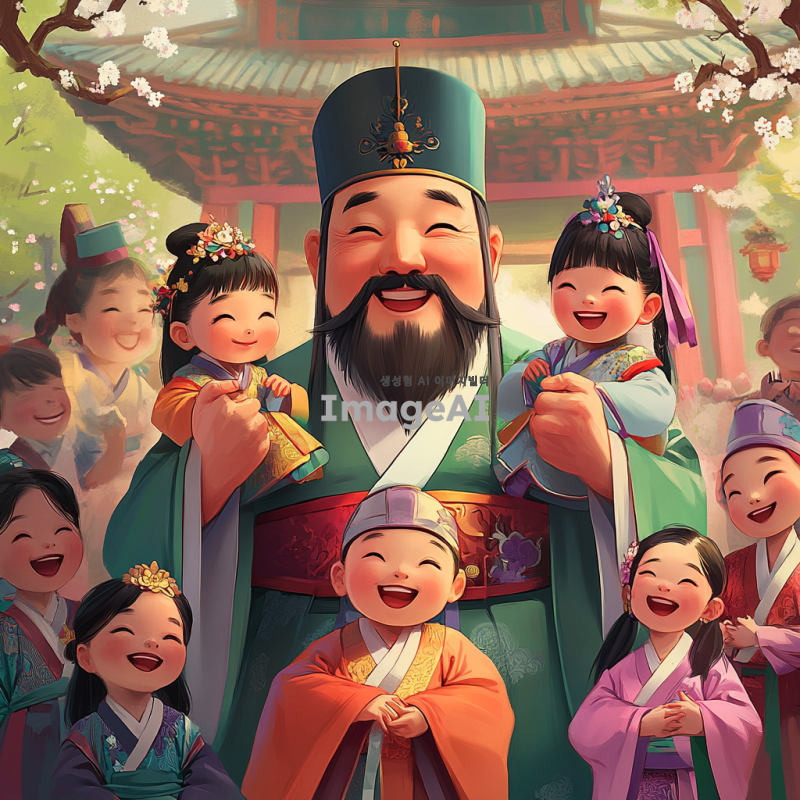 조선시대 장군 캐릭터, 아이들에게 친숙한 모습, 전통 한복을 입고, 따뜻한 미소를 지으며, 동화 같은 배경 속에서 아이들과 함께 있는 장면, 밝고 화사한 색감, 친근한 표정, 역사적 요소와 현대적 감각이 조화롭게 어우러진 이미지