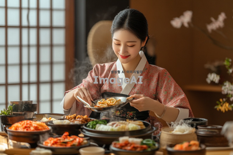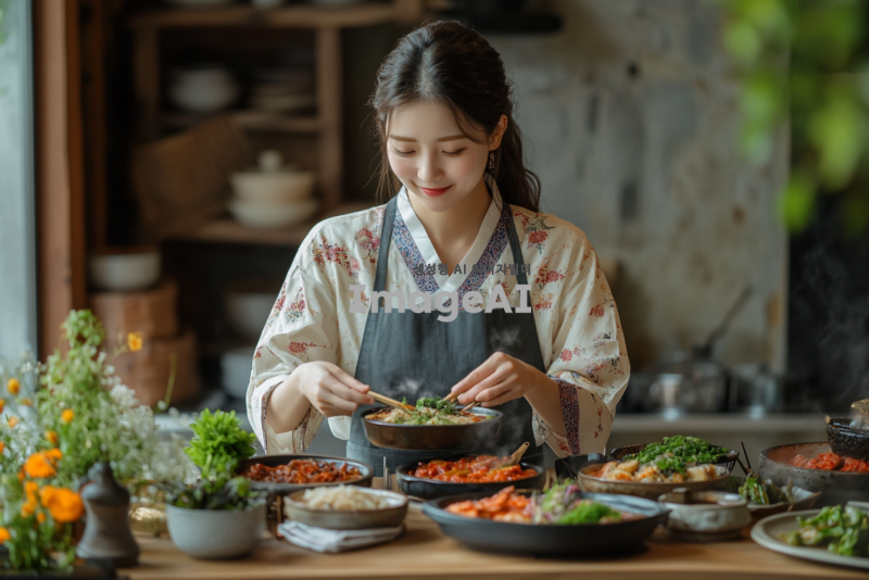 다채로운 한국 전통 음식을 맛있게 먹고 있는 2030 현대 한국 여성, 다양한 종류의 비빔밥, 김치, 불고기, 전통 떡, 정갈하게 차려진 상차림, 따뜻한 분위기, 즐거운 표정, 전통 한복을 입고 있는 모습, 한국의 전통 식문화가 느껴지는 배경