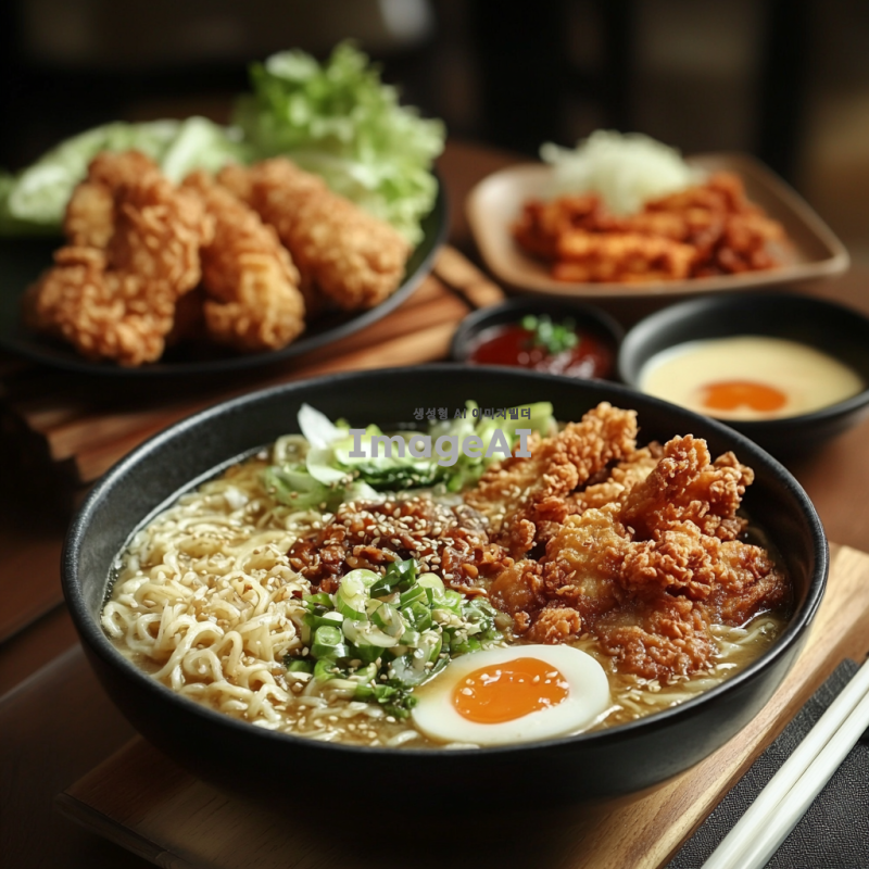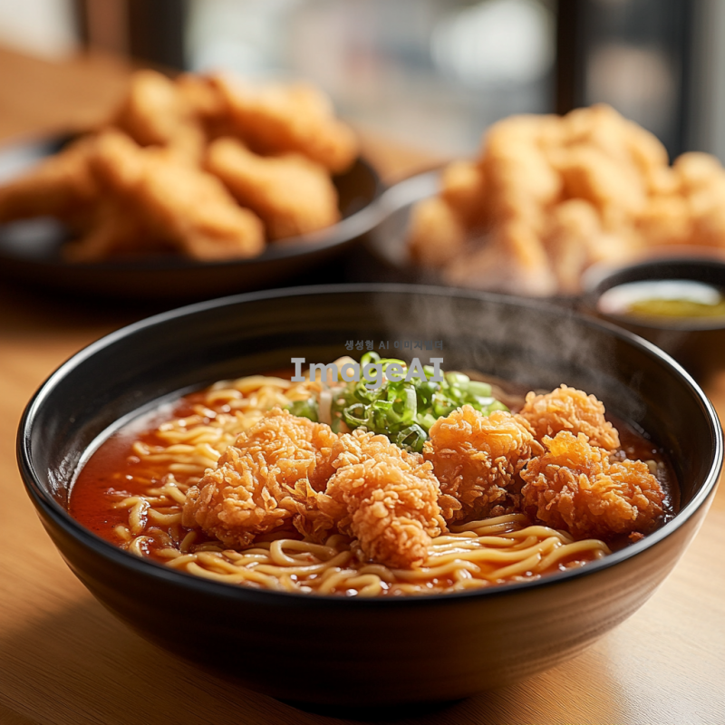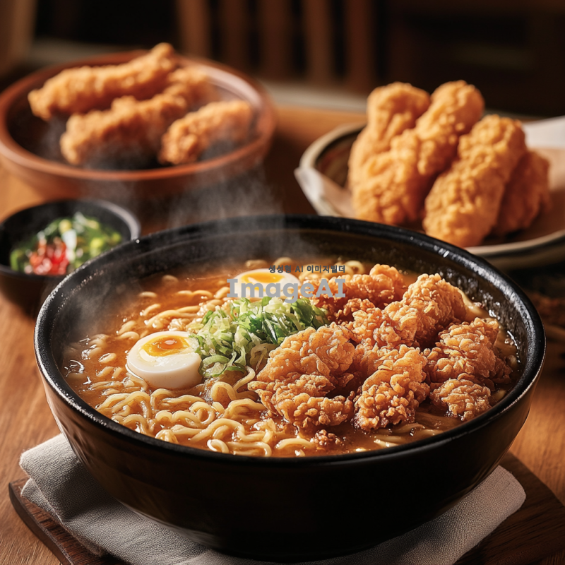 한국의 전통적인 라면과 바삭한 치킨이 함께 담긴 정갈한 한 상차림, 따뜻한 김이 나는 라면 그릇과 황금빛으로 튀겨진 치킨 조각들이 조화롭게 배치되어 있는 모습, 배경은 아늑한 식탁과 부엌의 따뜻한 조명, 식욕을 자극하는 색감과 질감, 편안하고 따뜻한 분위기.