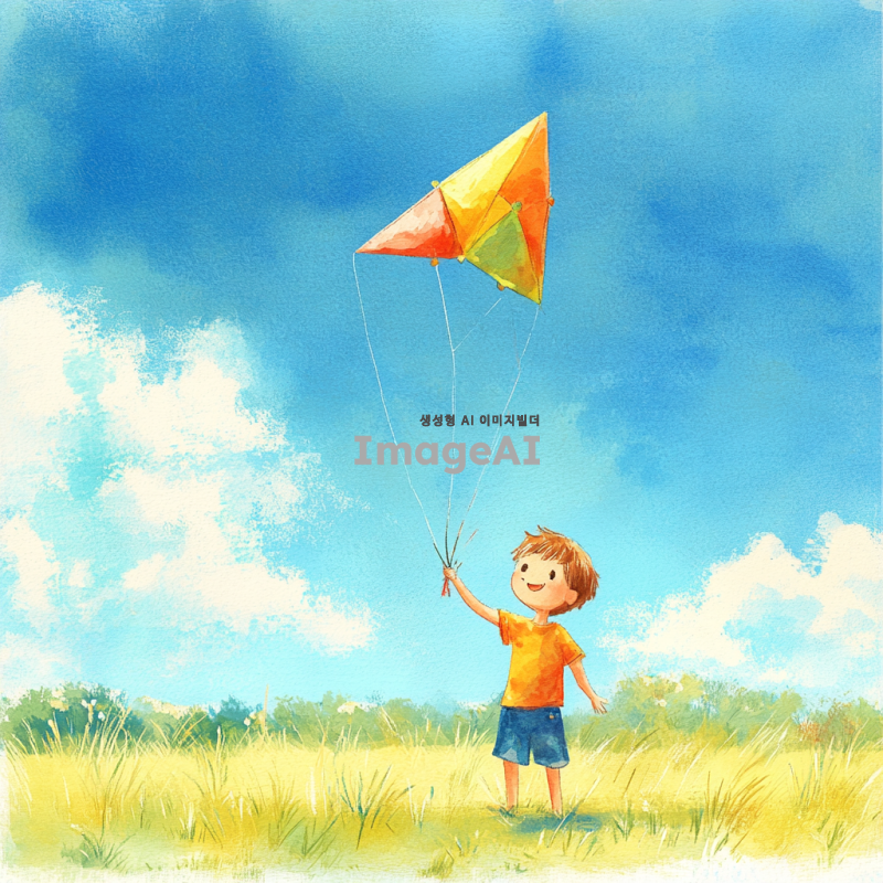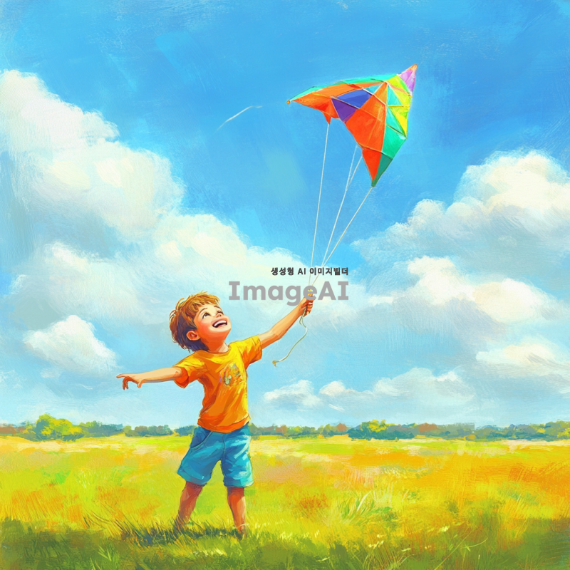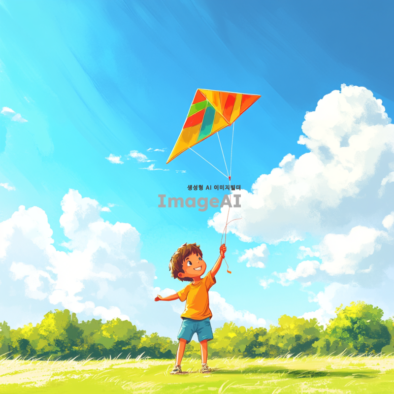 남자 어린이가 파란 하늘 아래 넓은 들판에서 연을 날리고 있는 모습. 어린이는 밝은 색상의 티셔츠와 반바지를 입고 있으며, 얼굴에는 행복한 미소가 가득하다. 연은 다채로운 색상으로, 바람에 휘날리며 하늘을 가로지르고 있다. 배경에는 푸른 하늘과 흰 구름, 그리고 푸른 풀밭이 펼쳐져 있어 평화롭고 즐거운 분위기를 연출하고 있다.