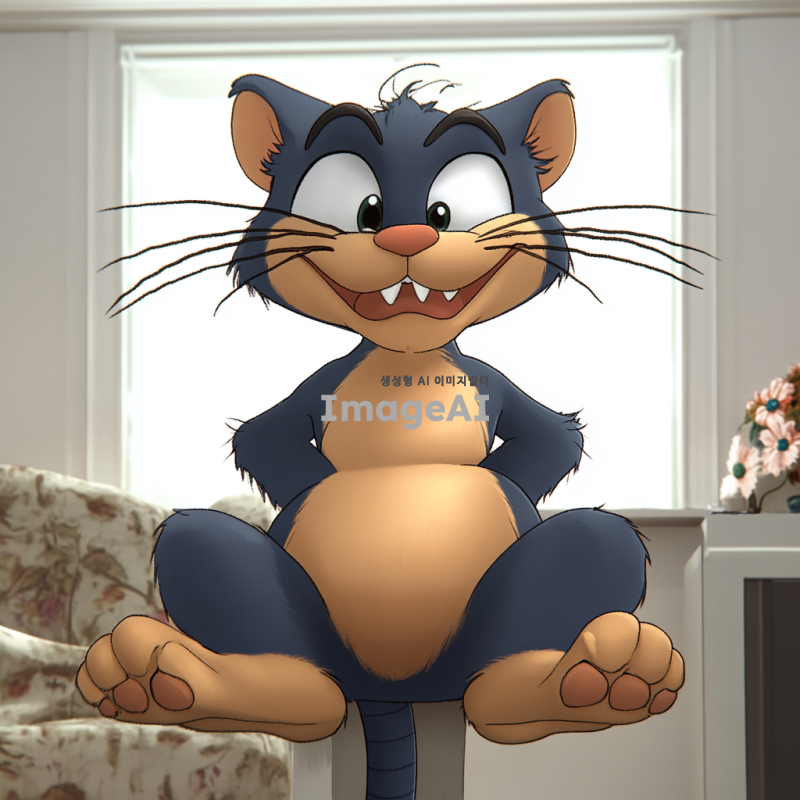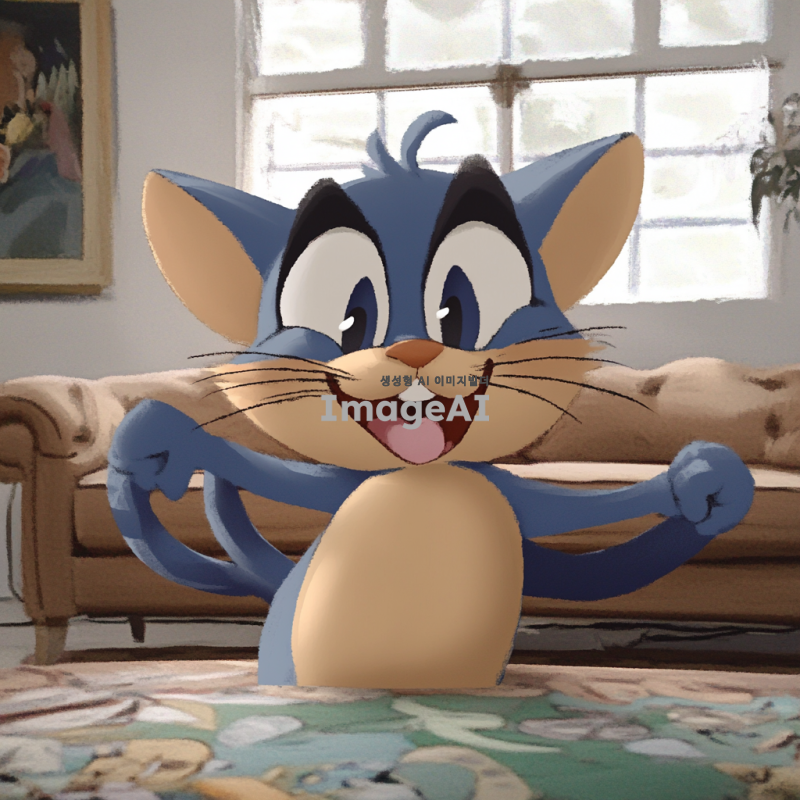 한국의 만화 스타일로 그려진 톰과 제리의 톰 캐릭터, 귀여운 표정과 생동감 넘치는 포즈, 배경은 아늑한 거실, 따뜻한 색감과 세밀한 디테일, 유머러스한 분위기 강조.