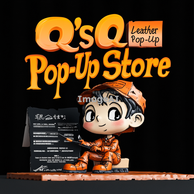 검은색 배경에 오렌지색과 흰색으로 "Q's Leather Pop-Up Store"라는 제목이 중앙에 위치해 있습니다. 그 아래에는 작은 남자 캐릭터가 중년의 모습으로 가죽공예 작업을 하고 있습니다. 그는 밝은 주황색 작업복을 입고 갈색 모자를 쓰고 있으며, 웃는 표정으로 작업에 집중하고 있습니다. 캐릭터는 앉아서 작업하는 자세로, 팝업 스토어를 알리는 간판 배경이 함께 그려져 있습니다. 간판의 상단은 밝은 주황색, 중앙은 흰색 폰트, 하단은 검은색, 빨간색, 흰색이 조화를 이루고 있습니다. 제목 아래에는 팝업 기간, 장소, 추가 정보가 표시되어 있습니다. 전체적인 분위기는 가죽공예 팝업 스토어의 홍보 이미지로, 남자 캐릭터는 이미지 중앙에 직면하고 있습니다. 구성은 상단에 제목을 두고 중앙에 주요 캐릭터를 배치하여 가독성과 시각적인 균형을 유지합니다. 색상은 따뜻한 오렌지, 갈색, 검정색 계열의 밝고 선명한 색상으로, 글자는 강렬하고 분명하게 나타납니다. 디자인 스타일은 만화풍이며, 빈티지한 느낌을 주는 일러스트레이션입니다.