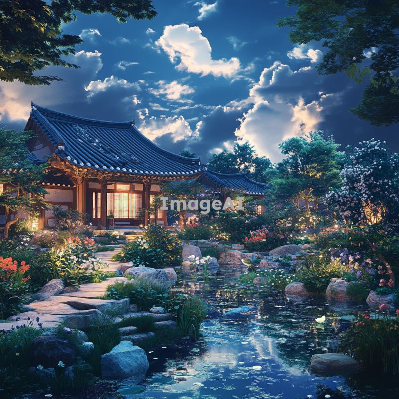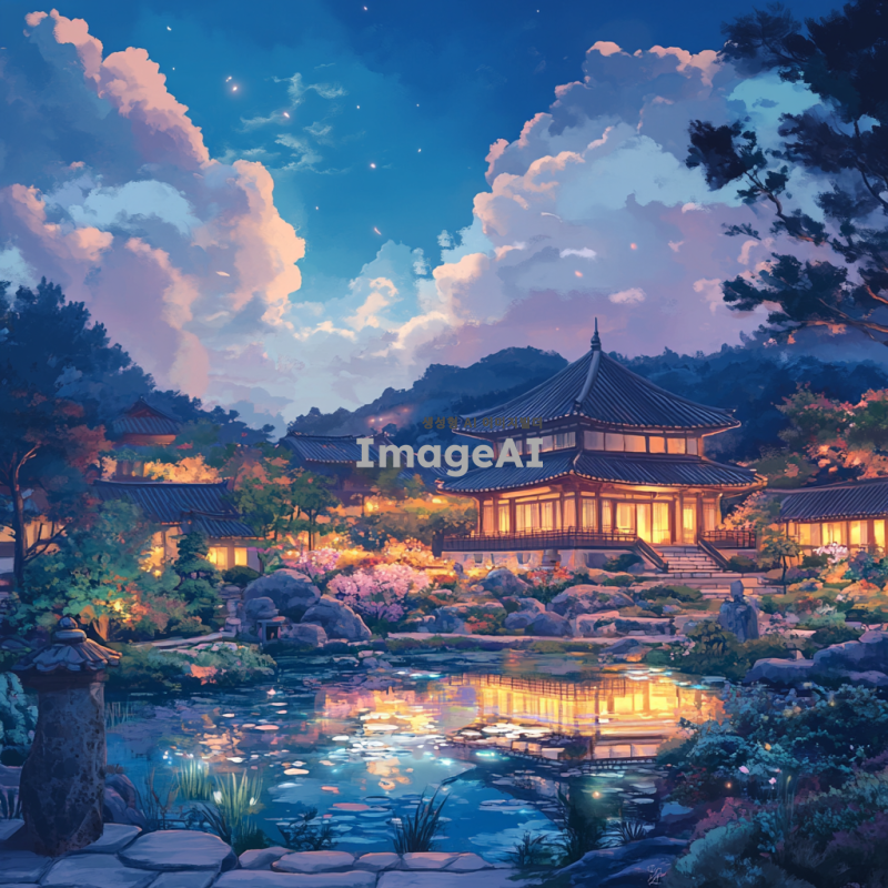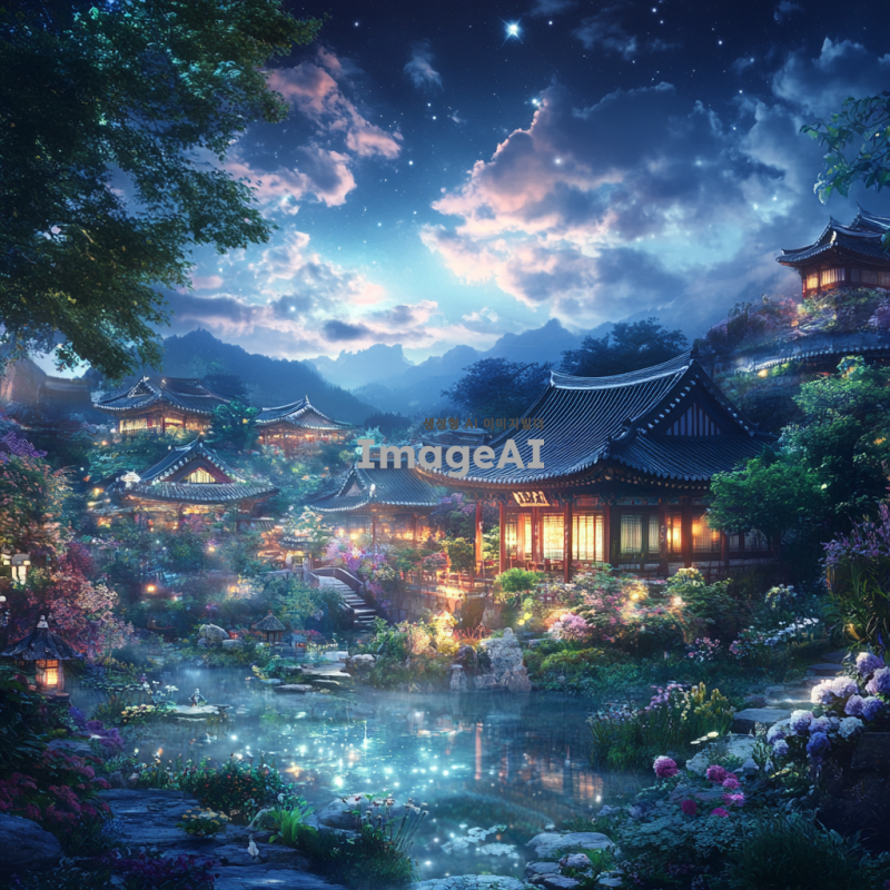 초현실적인 분위기로 변형된 한국의 전통 마을 풍경. 고요한 아침 안개 속에서 반짝이는 연못과 이국적인 식물들로 가득한 정원, 그리고 하늘을 가로지르는 화려한 색상의 구름. 전통 한옥이 신비롭게 빛나는 모습, 주변에 환상적인 생명체들이 어우러져 있는 장면. 전체적으로 몽환적이고 꿈같은 느낌을 강조하여 표현.