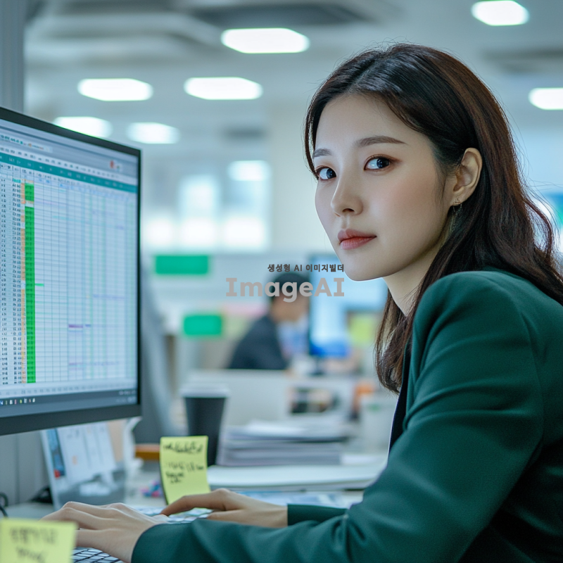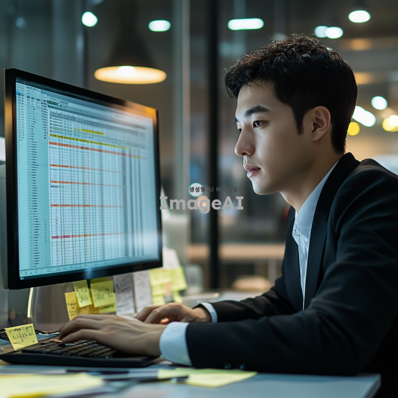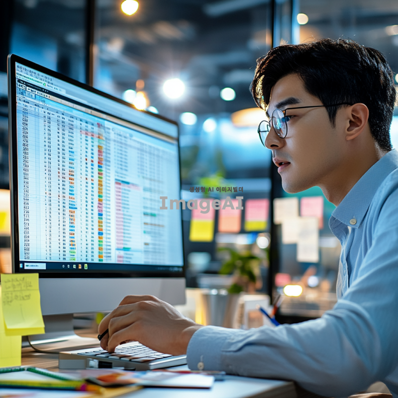 한국의 사무실 환경에서 엑셀 단축키를 사용하여 작업하는 한국인 직장인의 모습을 그려주세요. 배경에는 컴퓨터 화면이 보이고, 엑셀 프로그램의 인터페이스가 잘 보이도록 해주세요. 직장인은 집중한 표정으로 키보드를 누르고 있으며, 주변에는 메모지와 커피 컵이 놓여 있습니다. 조명은 밝고 현대적인 사무실 분위기를 연출해 주세요.