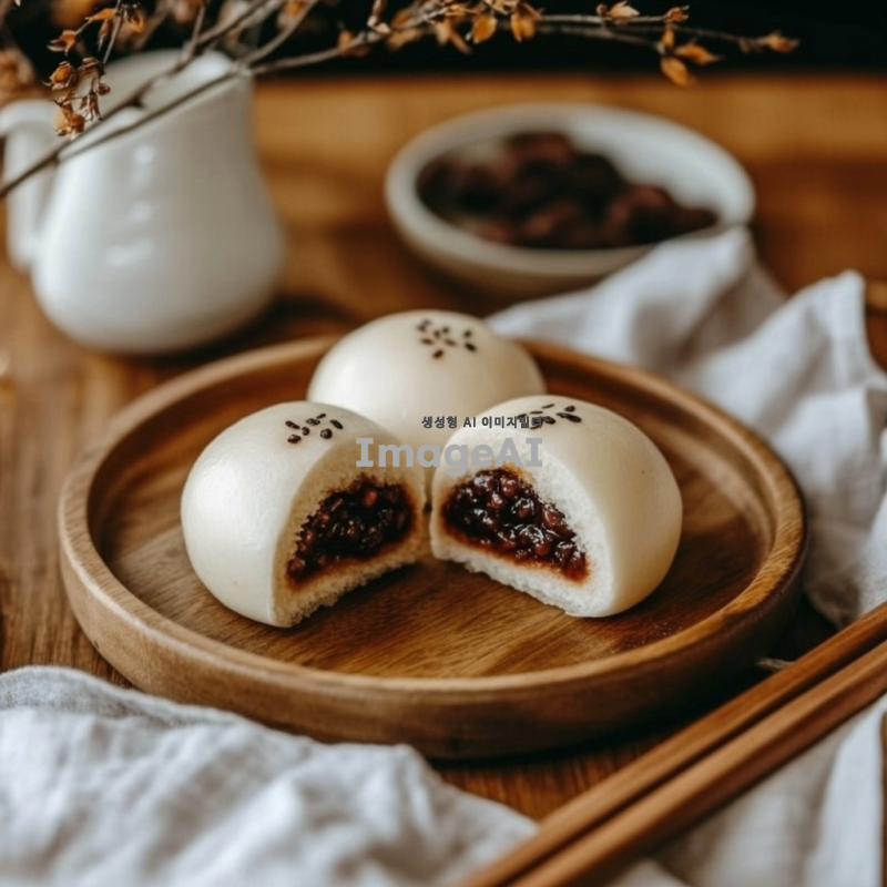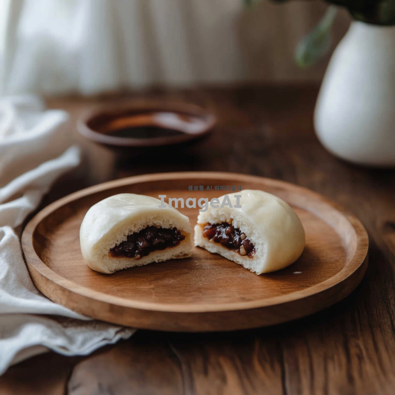 부드럽고 따뜻한 찐빵이 나무 접시에 놓여 있는 모습 반 갈라서 팥도 보이고