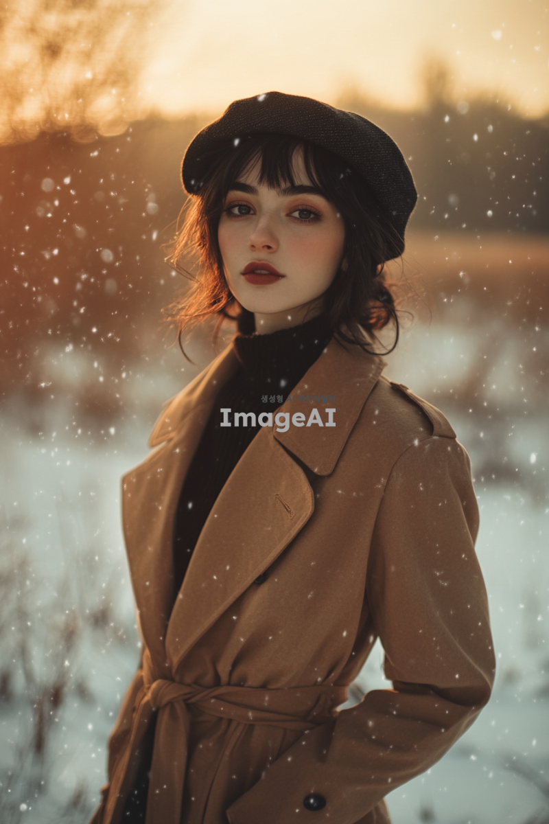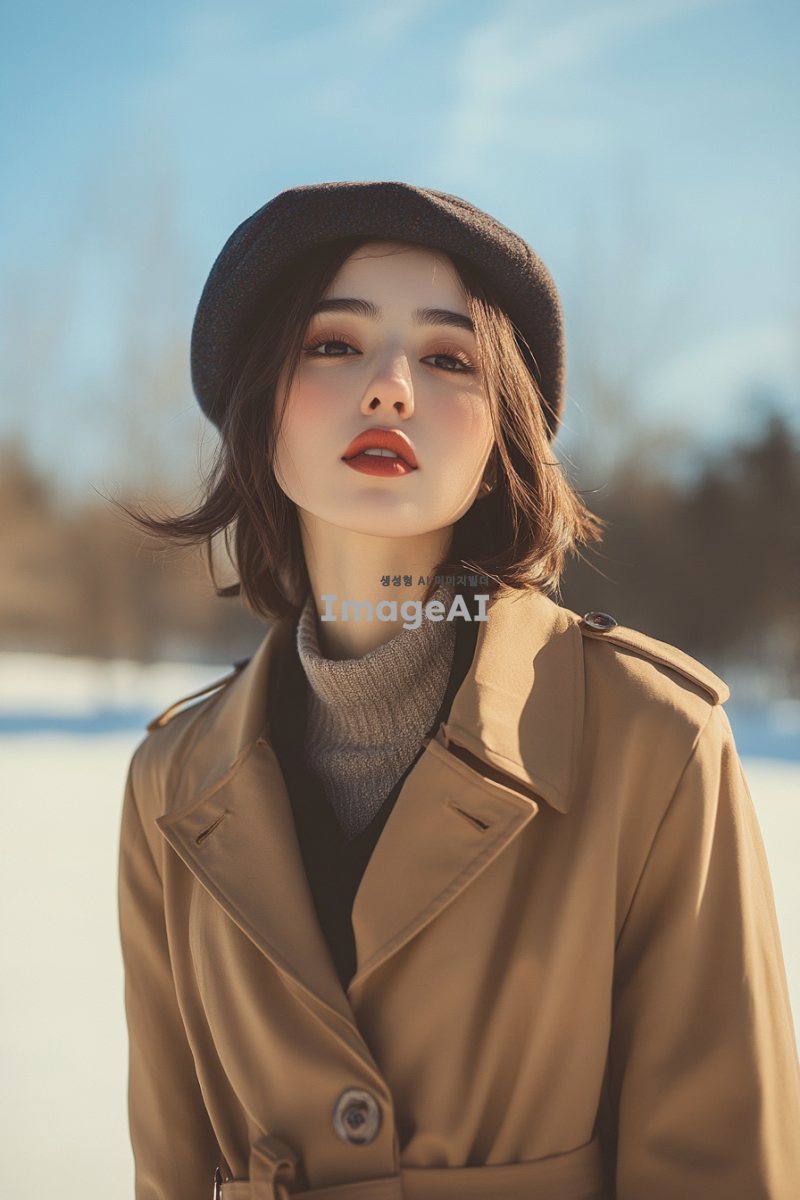 트랜치 코트를 입고 정모를 쓴 여성의 전신 모습, 부드러운 조명 아래에서 자연스럽게 서 있는 자세, 배경은 겨울 풍경으로, 따뜻한 느낌을 주는 색감으로, 우아하고 세련된 스타일을 강조하며, 여성의 표정은 편안하고 자신감 있는 모습으로 표현.