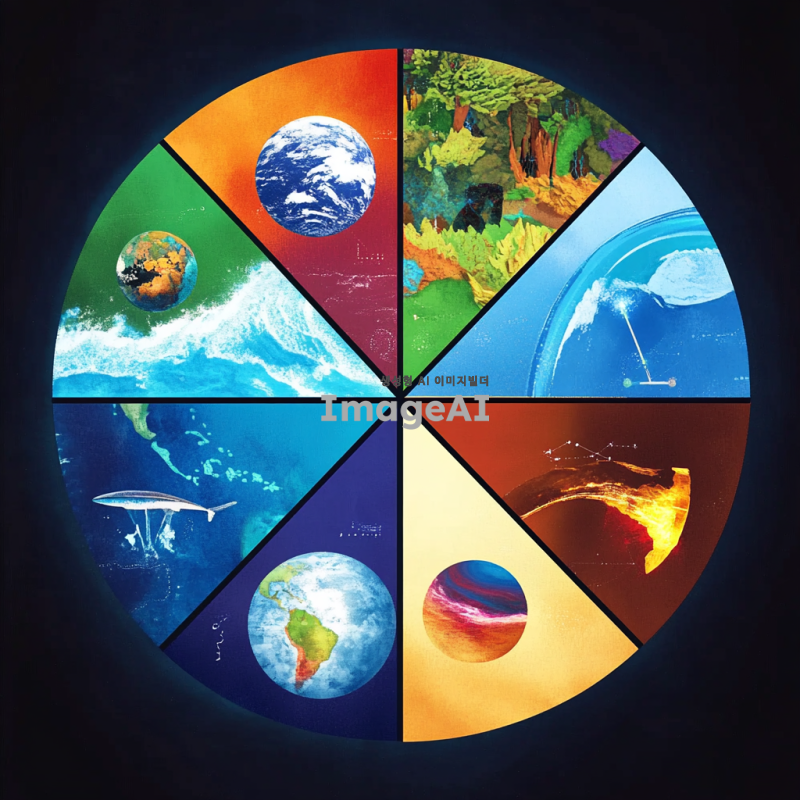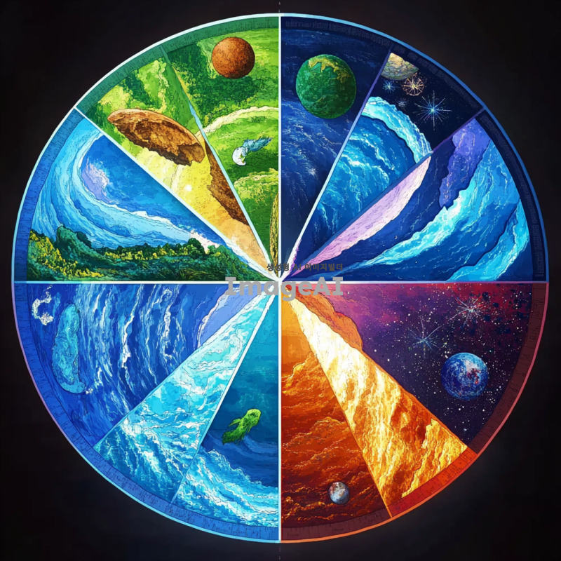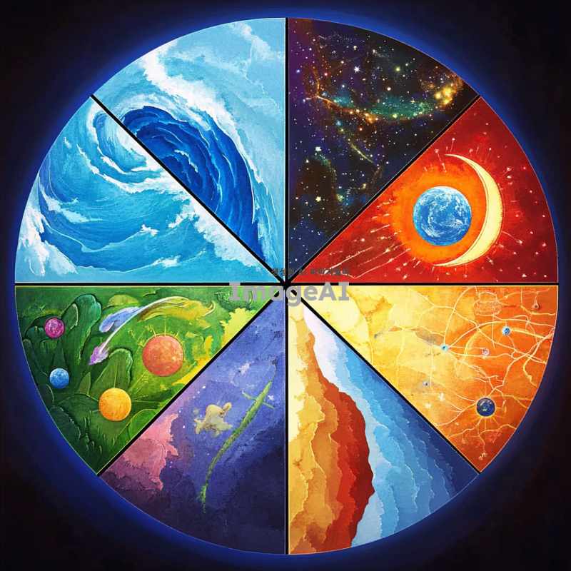 원형 모양에서 6개의 동등하고 대칭적인 모양으로 섹션을 나눈다. 각 섹션은 독특한 색상, 텍스처 및 주제 그래픽 요소를 가진 다른 과학 분야를 나타냅니다. 각 섹션은 고유 한 테마와 색상 팔레트를 유지하면서 인접 섹션에 부드럽게 혼합되어야합니다
