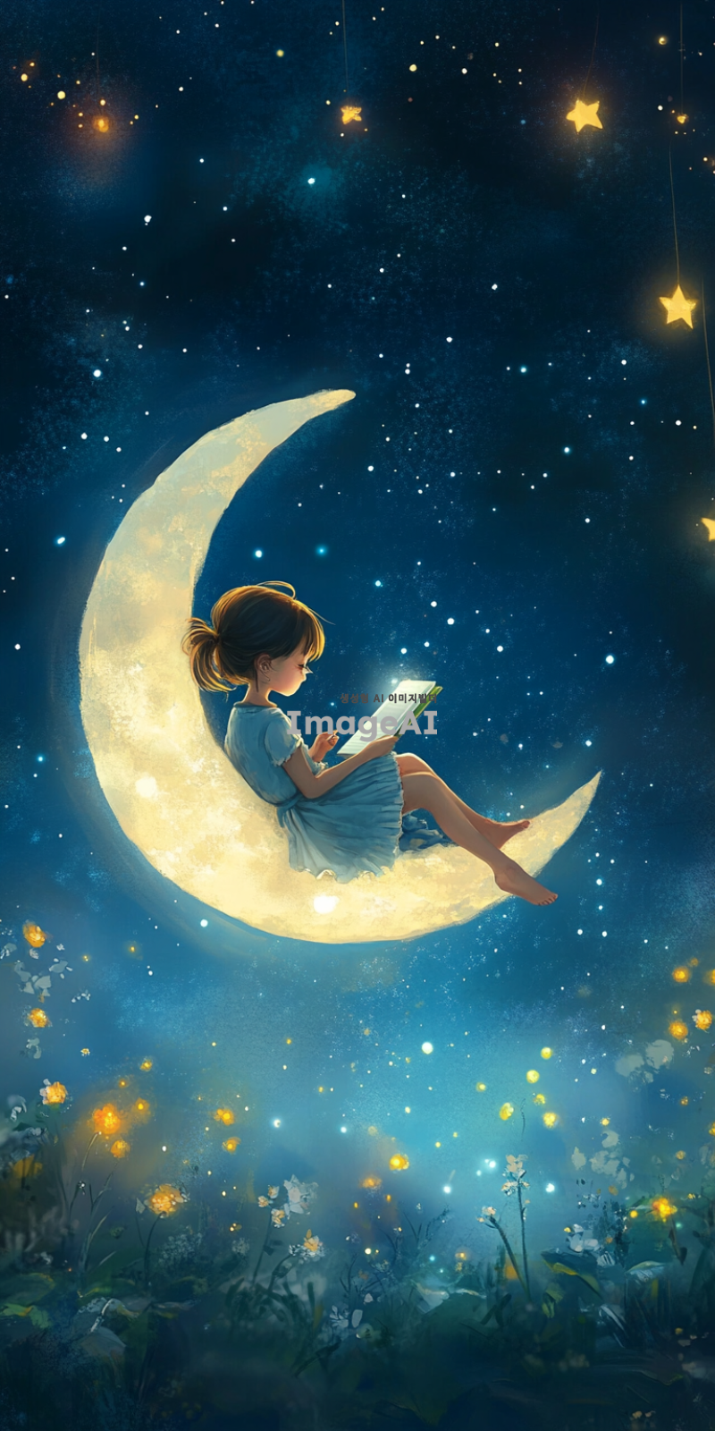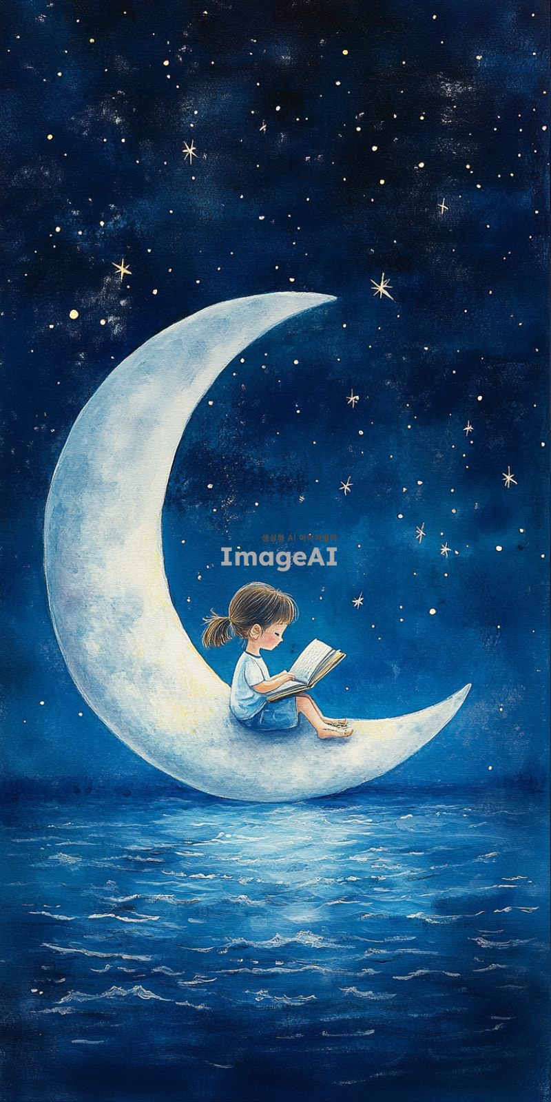 초승달 위에 앉아 책을 읽고 있는 한국인 아이의 모습, 부드러운 달빛이 아이를 비추고 있는 장면, 고요한 밤하늘과 별들이 반짝이는 배경, 아이의 표정은 집중하고 있는 모습, 세로형 구성