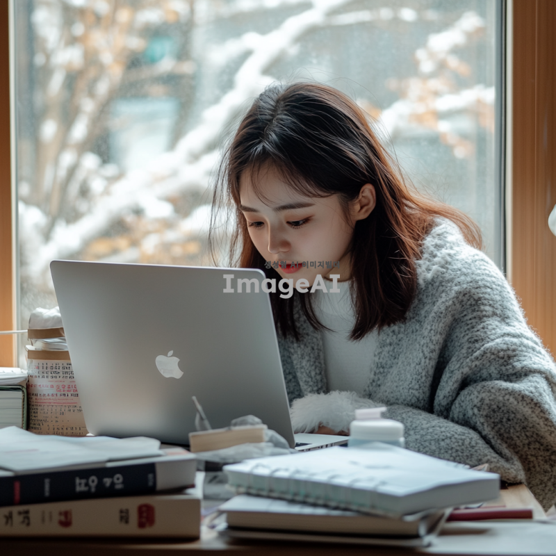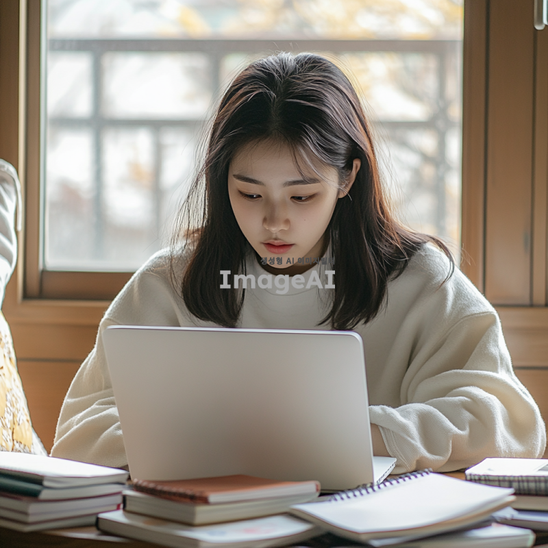 흰색 노트북 앞에 앉아 열심히 공부하는 한국 여대생, 책과 노트가 주변에 흩어져 있고 집중하는 표정, 자연광이 들어오는 창가에서 학습하는 모습, 편안한 옷차림, 차분한 분위기