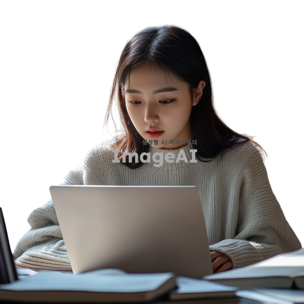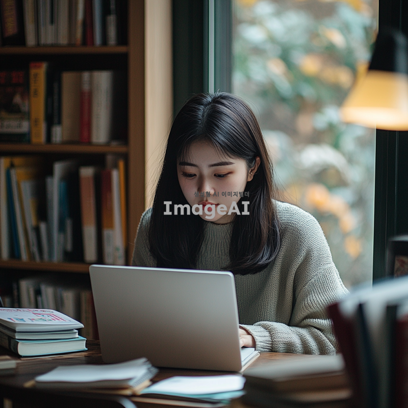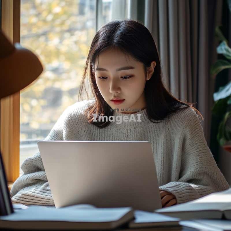 각진 모서리의 흰색 노트북을 사용하여 공부하는 한국 여대생, 조용한 도서관에서 집중하는 모습, 책과 노트가 주변에 놓여 있고, 자연광이 들어오는 창가에 앉아 있는 장면, 편안한 캐주얼 의상을 입고 있는 모습.