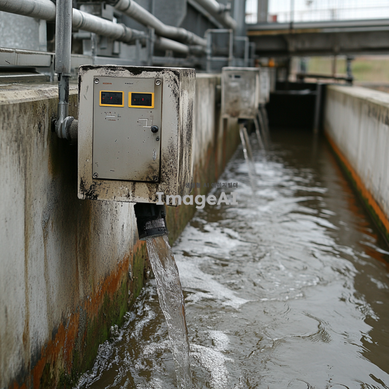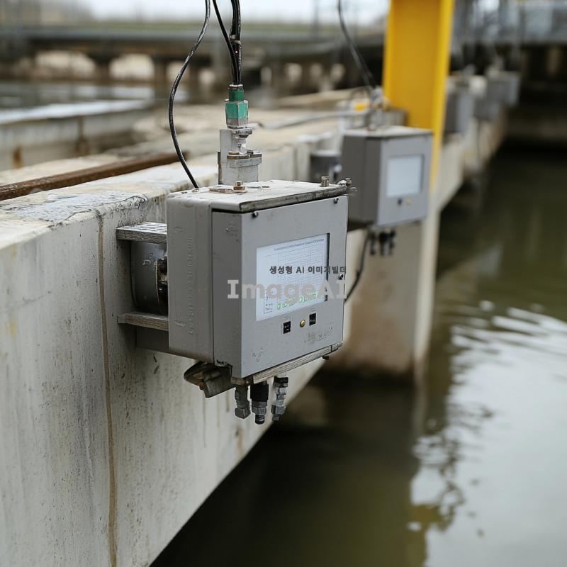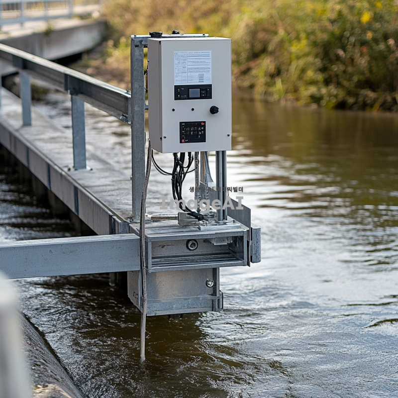 초음파 수위계가 설치된 가동보의 세부적인 기계 장치와 센서의 디테일 강조,