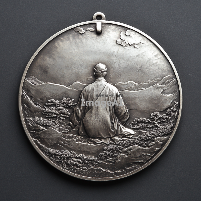 한국의 광복을 기념하는 은메달 디자인, 중앙에 태극기와 독립운동가의 실루엣을 적용