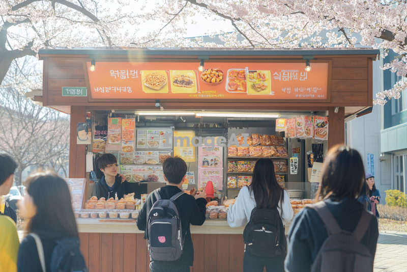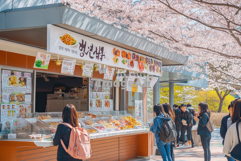 여고 앞 분식집 풍경, 다양한 분식 메뉴가 진열된 가게 외관, 학생들이 모여 앉아 수다를 나누고 있는 모습, 따뜻한 조명 아래에서 즐거운 분위기, 한국 전통 분식인 떡볶이, 순대, 김밥 등이 보이는 장면, 아기자기한 인테리어와 소품들, 봄날의 화창한 날씨, 주변에 벚꽃이 피어 있는 모습, 학생들의 유니폼이 잘 보이도록.
