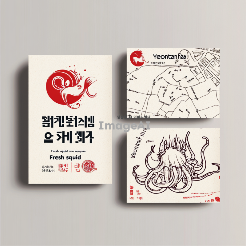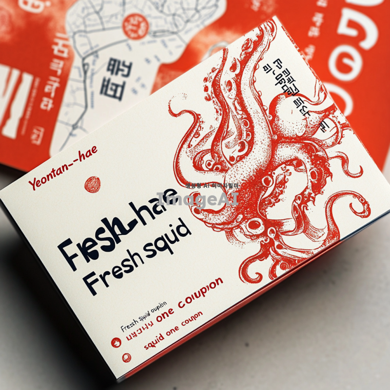 명함 두개 크기의 쿠폰을 만들거야 겉 면에는 연탄해 라는 글씨와 함께 로고가 써있고 안에 내용은 생오징어 한 마리 쿠폰이라고 써있고 한 쪽면에 약도가 그려져 있어. 배경색은 빨간색이었으면 좋겠어