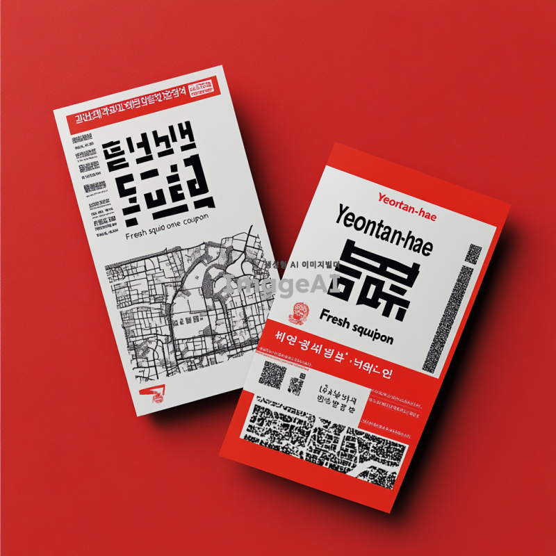 명함 두 개 크기의 쿠폰 디자인. 겉면에는 "연탄해"라는 글씨와 함께 로고가 prominently 배치되어 있으며, 안쪽에는 "생오징어 한 마리 쿠폰"이라는 문구가 적혀 있습니다. 한쪽 면에는 약도가 그려져 있고, 전체 배경색은 빨간색입니다. 쿠폰 디자인은 현대적이고 깔끔한 느낌을 주며, 시각적으로 매력적이고 눈에 띄는 요소들이 포함되어 있습니다.