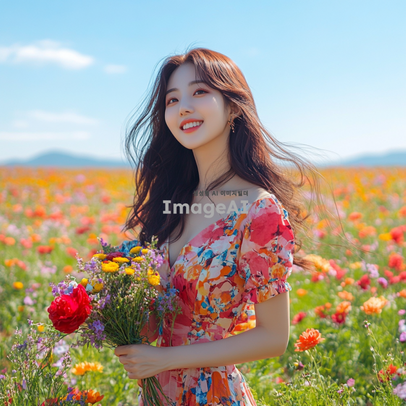 봄날의 화창한 날씨 속에서 아름다운 꽃들 사이에 서 있는 한국인 여성의 모습. 그녀는 화사한 꽃무늬 드레스를 입고 있으며, 손에는 화려한 꽃다발을 들고 있다. 배경에는 만개한 꽃밭과 푸른 하늘이 펼쳐져 있고, 여성의 얼굴에는 행복한 미소가 가득하다. 이 장면은 봄의 생동감과 아름다움을 강조하며, 여성의 우아함과 자연의 조화를 표현한다. 또한, 주변에 금전적인 상징을 연상시키는 소품들이 subtly 배치되어 있어, 봄과 함께하는 풍요로움을 암시한다.