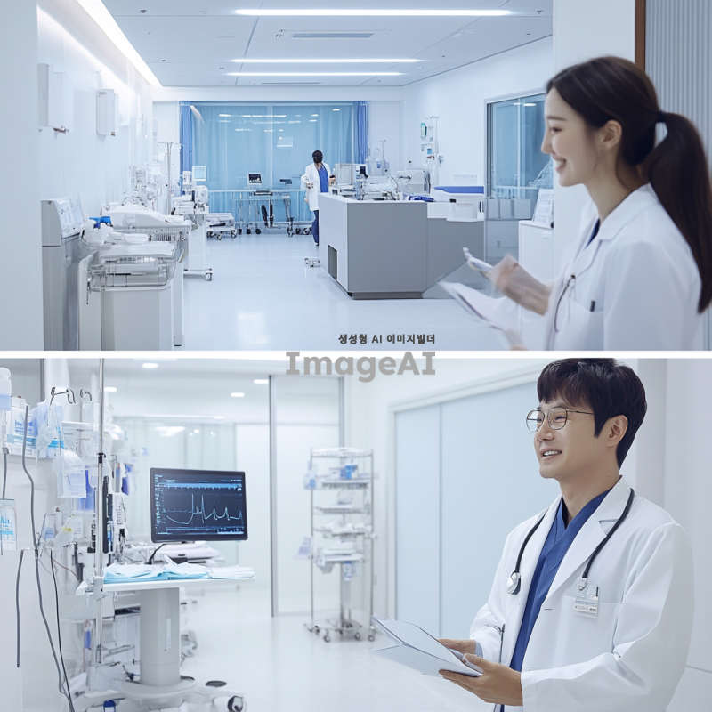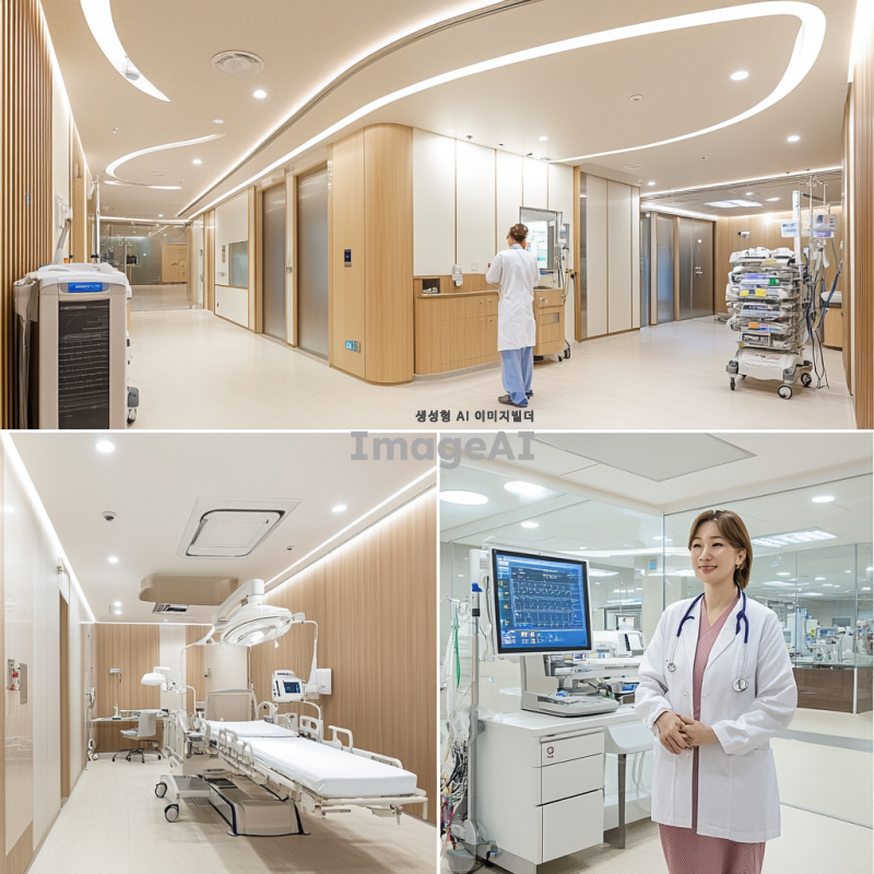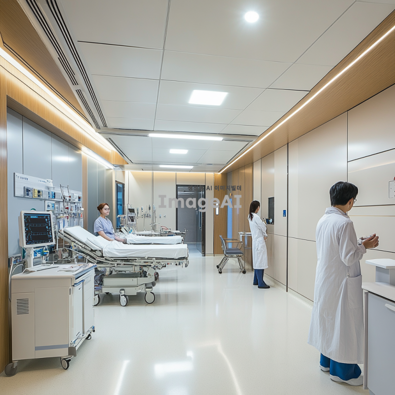 병원 내부의 현대적인 의료 환경, 환자와 의사가 소통하는 모습, 첨단 의료기기들이 배치된 진료실, 깨끗하고 안전한 분위기, 다양한 의료 장비가 조화롭게 어우러진 모습, 한국인 의사와 환자가 대화하는 장면, 따뜻한 조명이 비추는 병원 공간.