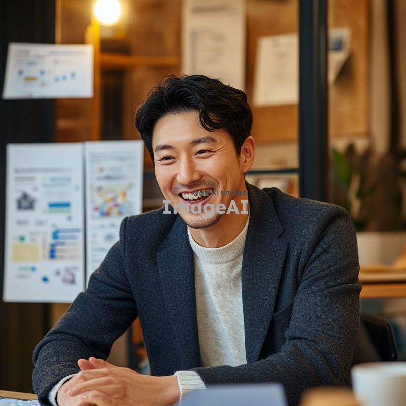친근한 분위기의 부동산 창업 컨설턴트를 그려주세요. 한국인 남성이며, 밝은 미소를 지으며 고객과 대화하는 모습입니다. 사무실 배경에는 부동산 관련 자료와 차트가 보이고, 따뜻한 색조의 조명이 감도는 아늑한 공간입니다. 고객과의 신뢰를 구축하는 모습이 강조되도록 해주세요.
