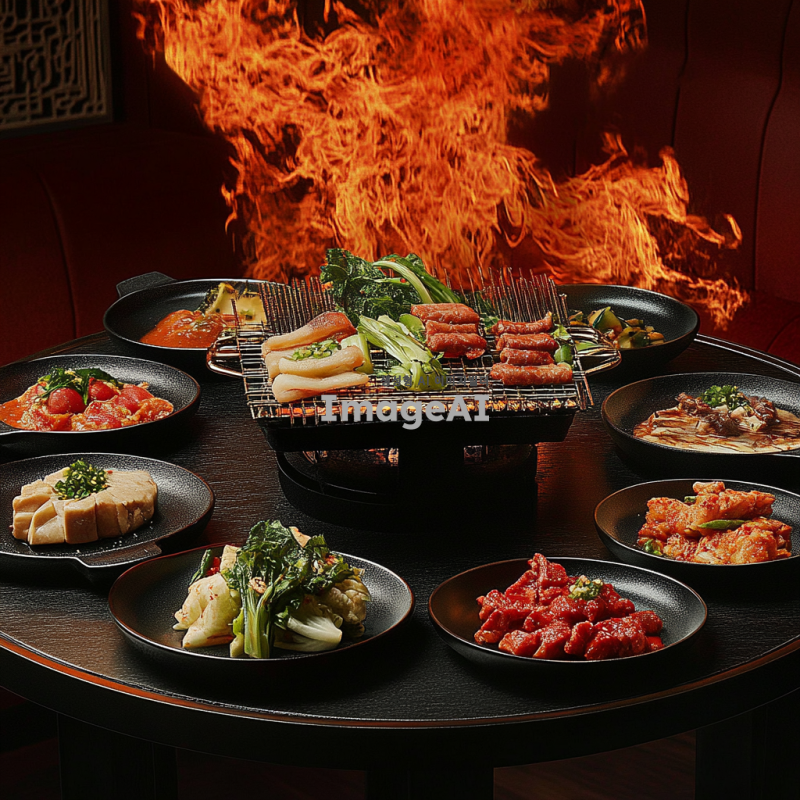 직화 요리 전문점의 주방에서 불 맛을 강조한 요리들이 정갈하게 플레이팅된 모습. 강렬한 빨간색의 불꽃이 요리 위로 올라오고, 다양한 직화 요리가 테이블에 놓여져 있어요. 고기와 채소가 잘 구워져 윤기가 흐르고, 신선한 재료들이 조화롭게 배치되어 있어요. 배경은 따뜻한 조명으로 아늑한 분위기를 연출하며, 한국 전통적인 요소가 가미된 인테리어가 보입니다. 전체적으로 맛있고 풍미 가득한 느낌을 주는 이미지.