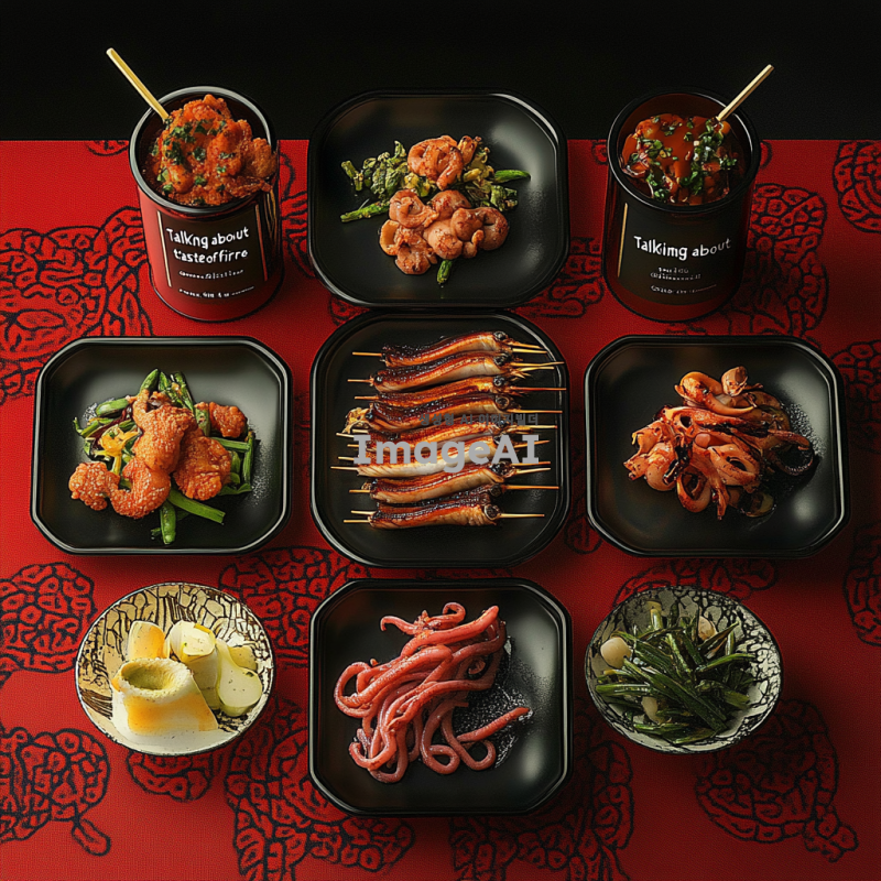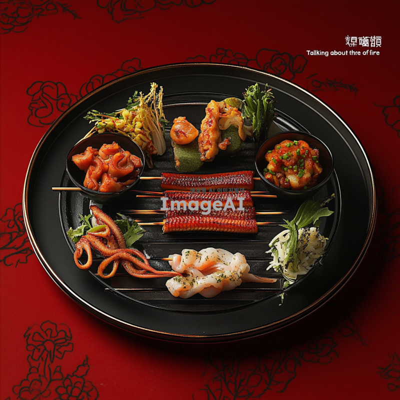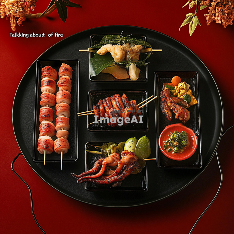 강렬한 빨간색 배경 위에 신선한 직화꼼장어, 직화오징어, 직화쭈꾸미, 직화닭목살이 정갈하게 플레이팅된 모습. 각 재료는 불에 구워져 윤기 나는 육즙과 함께 탱글탱글한 식감이 강조되며, 불맛이 느껴지는 연기가 살짝 올라오는 장면. 직화 요리의 깊은 풍미를 강조하는 소스가 곁들여져 있고, 주변에는 신선한 채소와 함께 조화를 이루는 모습. "불 맛을 이야기하다"라는 슬로건이 세련된 글씨체로 배치되어, 직화설의 철학과 가치를 잘 전달하는 이미지.